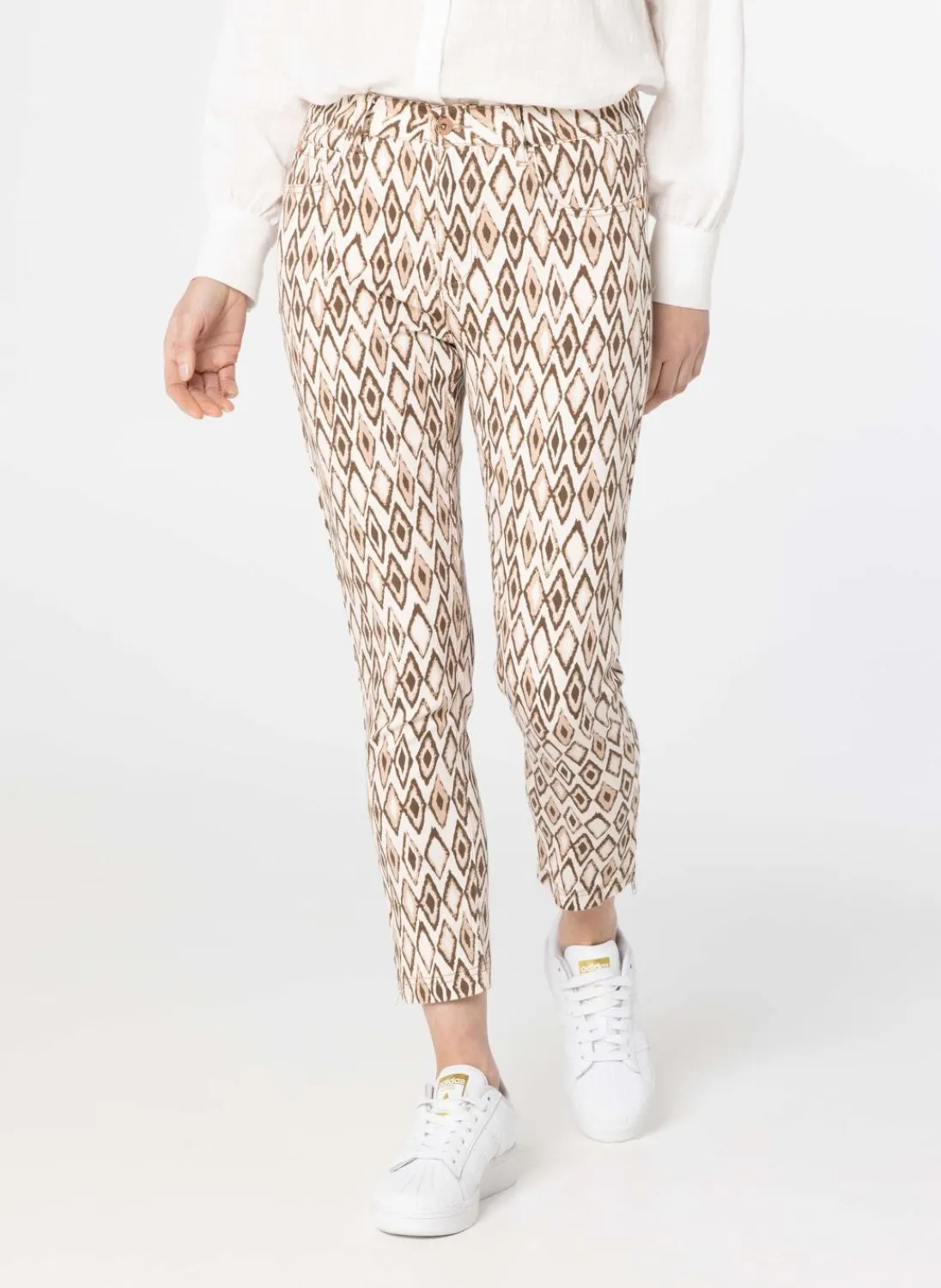 Beige 5-Pocket Skinny Jeans Met Bruine Ruit Motief. De Voor- En Achterzijde Zijn Voorzien Van Zakken En Onderaan De Broekspijp Is Een Extra Detail Toegevoegd: Een Ritssluiting. De Broek Heeft Veel Stretch En Valt Tot Enkelhoogte.