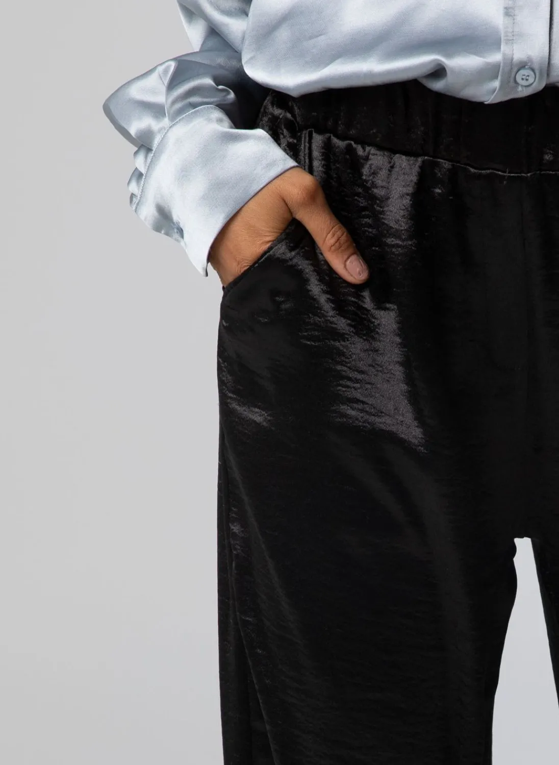 Een Glanzende, Zwarte Wide Fit Broek Met Een Comfortabele Elastische Tailleband, Twee Handige Steekzakken Aan De Zijkant En Één Stijlvolle Paspel-Sierzak Aan De Achterkant. Deze Veelzijdige Broek Is Onderdeel Van Een Trendy Co-Ord Set, Perfect Om Je Look Compleet Te Maken.