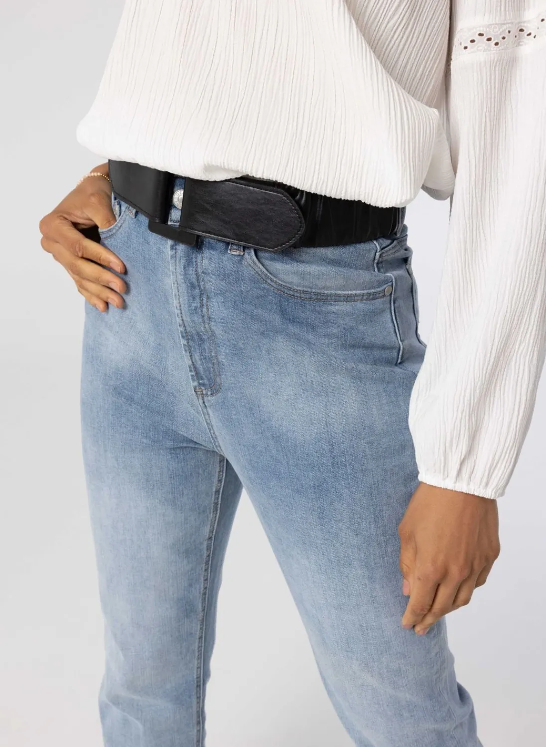 Zwarte Riem Met Leren Look En Een Zwarte Rechthoekige Sluiting. De Riem Heeft Veel Stretch.