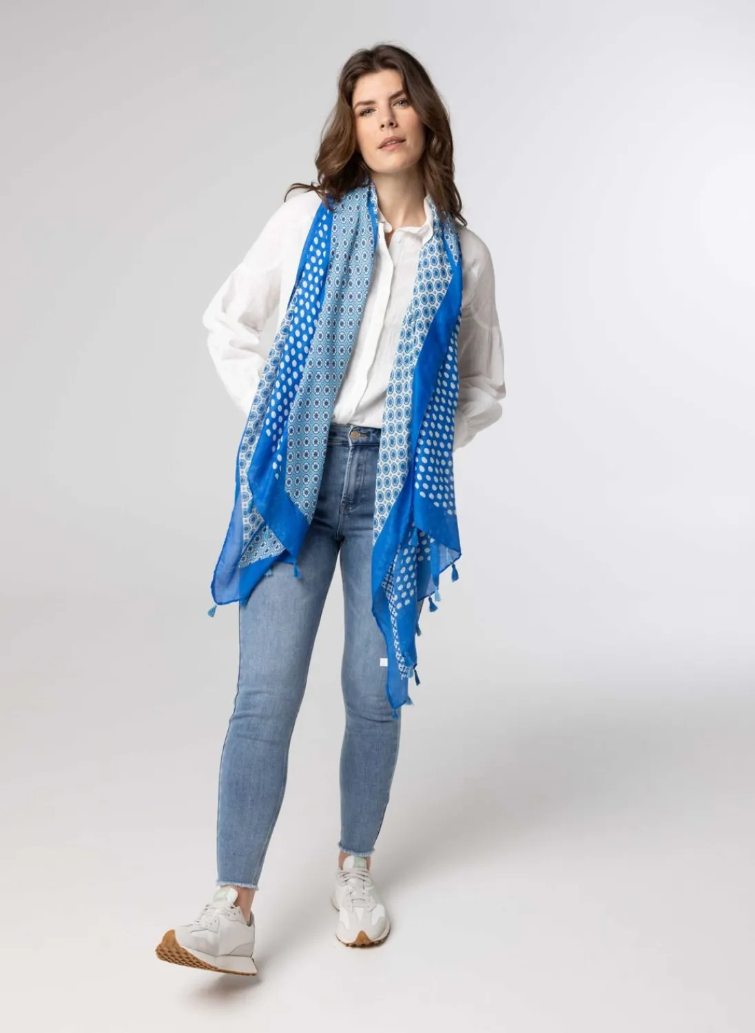 Een Blauwe Lichtgewicht Geweven Sjaal Met Een Unieke Print, Subtiel Afgewerkt Met Speelse Kwastjes. Dit Prachtige Accessoire Voegt Moeiteloos Een Vleugje Elegantie En Verfijning Toe Aan Elke Outfit, Waardoor Het Een Must-Have Toevoeging Is Aan Je Garderobe