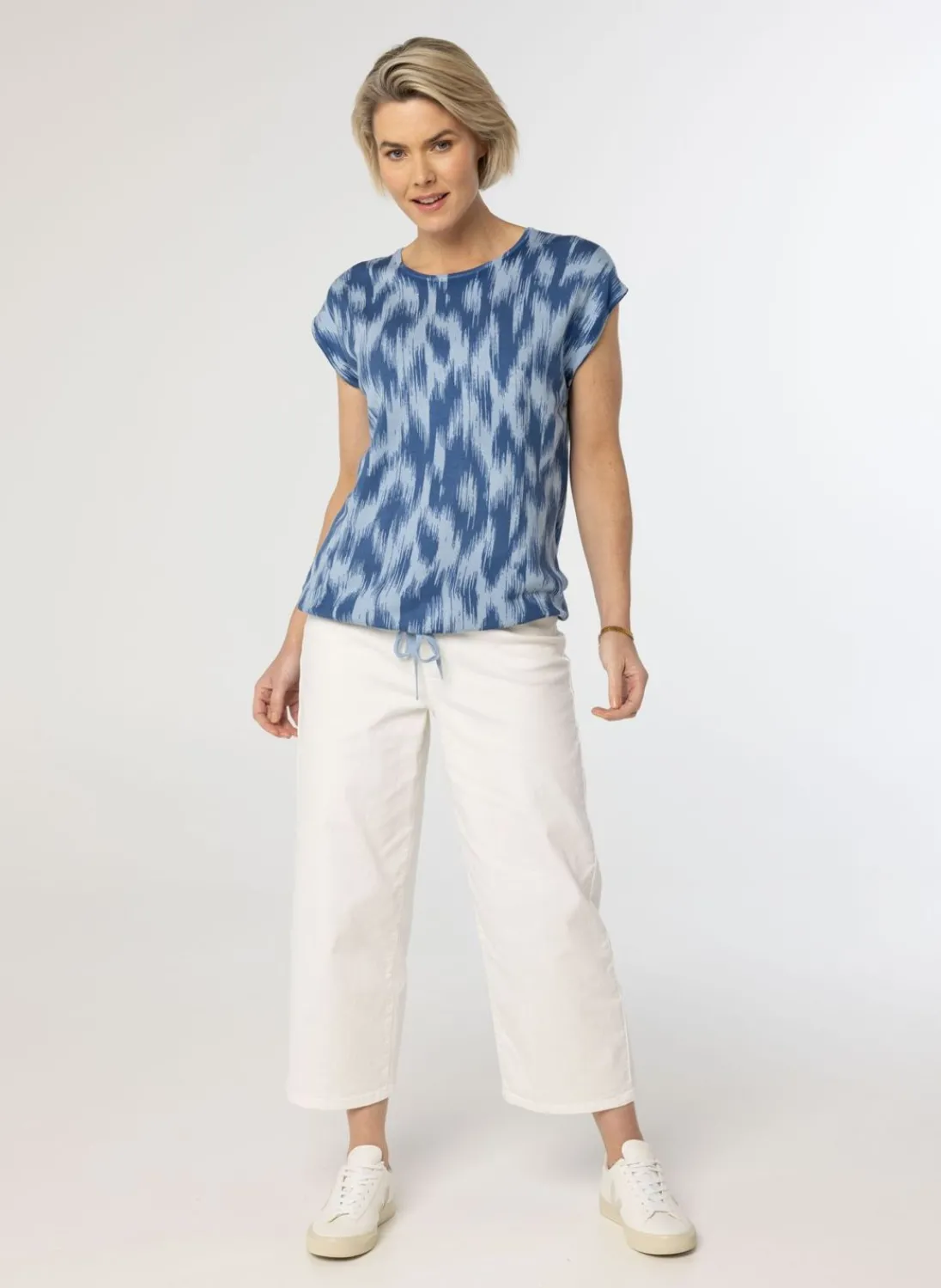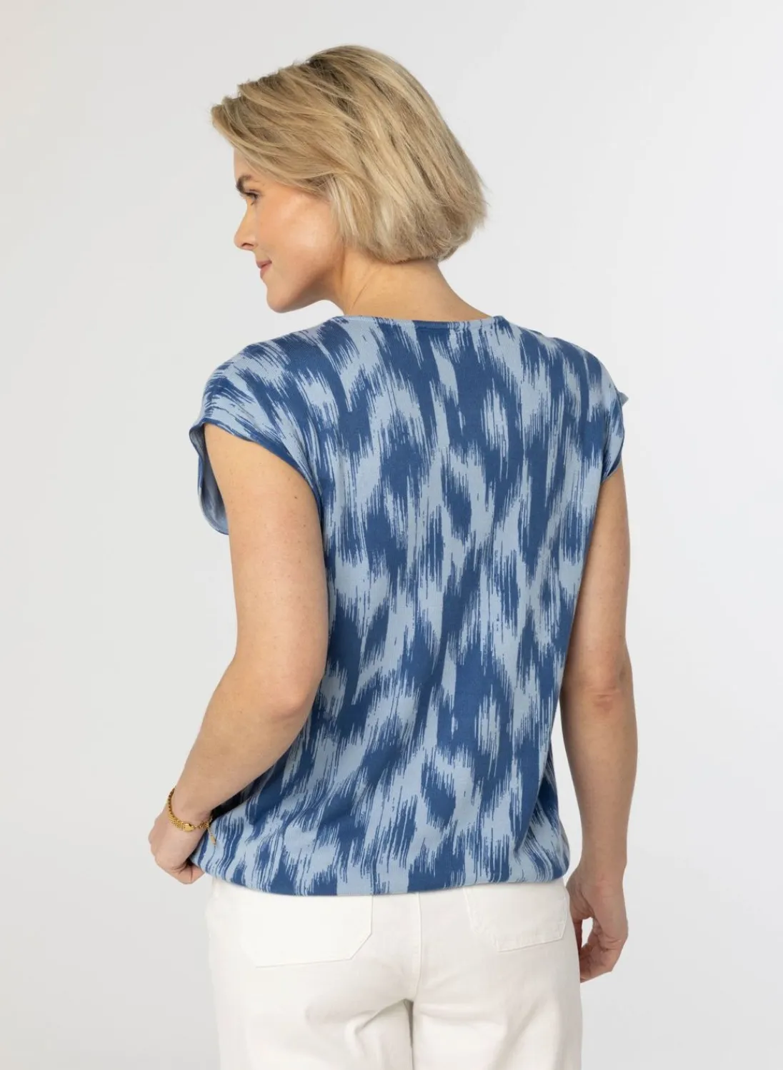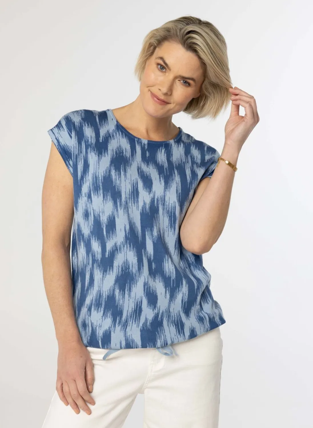 Een Los Vallende Fijngebreide Trui Met Een Gestreepte Print, Korte Aangeknipte Mouwen En Een Ronde Halslijn. Onderaan Heeft De Trui Een Trekkoord, Die Je Zelf Naar Wens Kunt Aantrekken En Strikken. In Deze Print En Kleur Hebben We Ook Een Los Vallend Blouse.