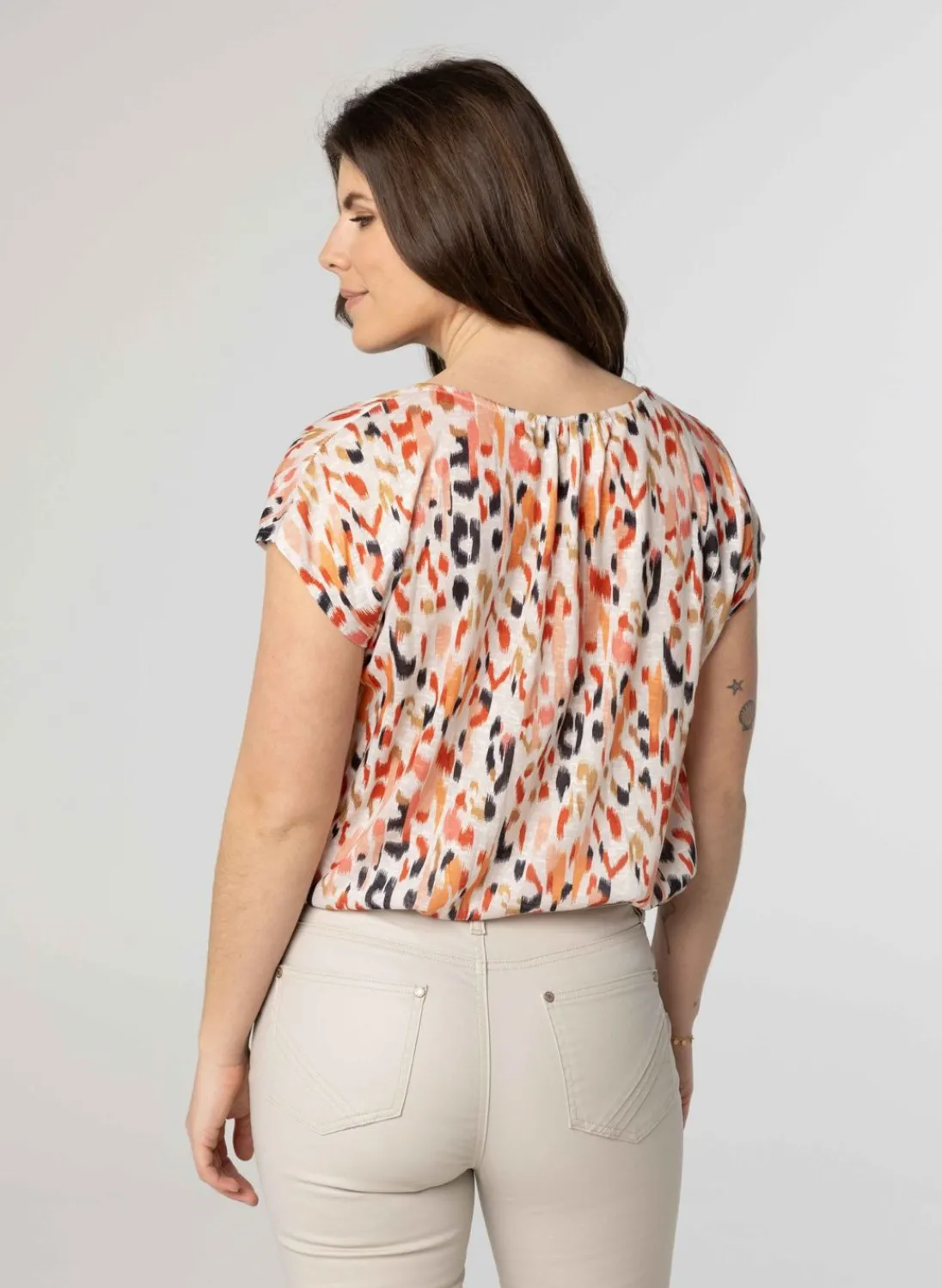 Meerkleurig Fijngebreid Shirt Met V-Hals, Ruches En Ingestikte Plooien. Het Shirt Heeft Een Kapmouw. De Kleuren Van Het Shirt: Beige, Donkerblauw, Oranje, Roze, Zalm En Goudgeel. Daarnaast Zitten Korte Splits Op De Heupen. De Plooien Lopen Door In De Hals. In Deze Print Hebben We Ook Een Blouse.