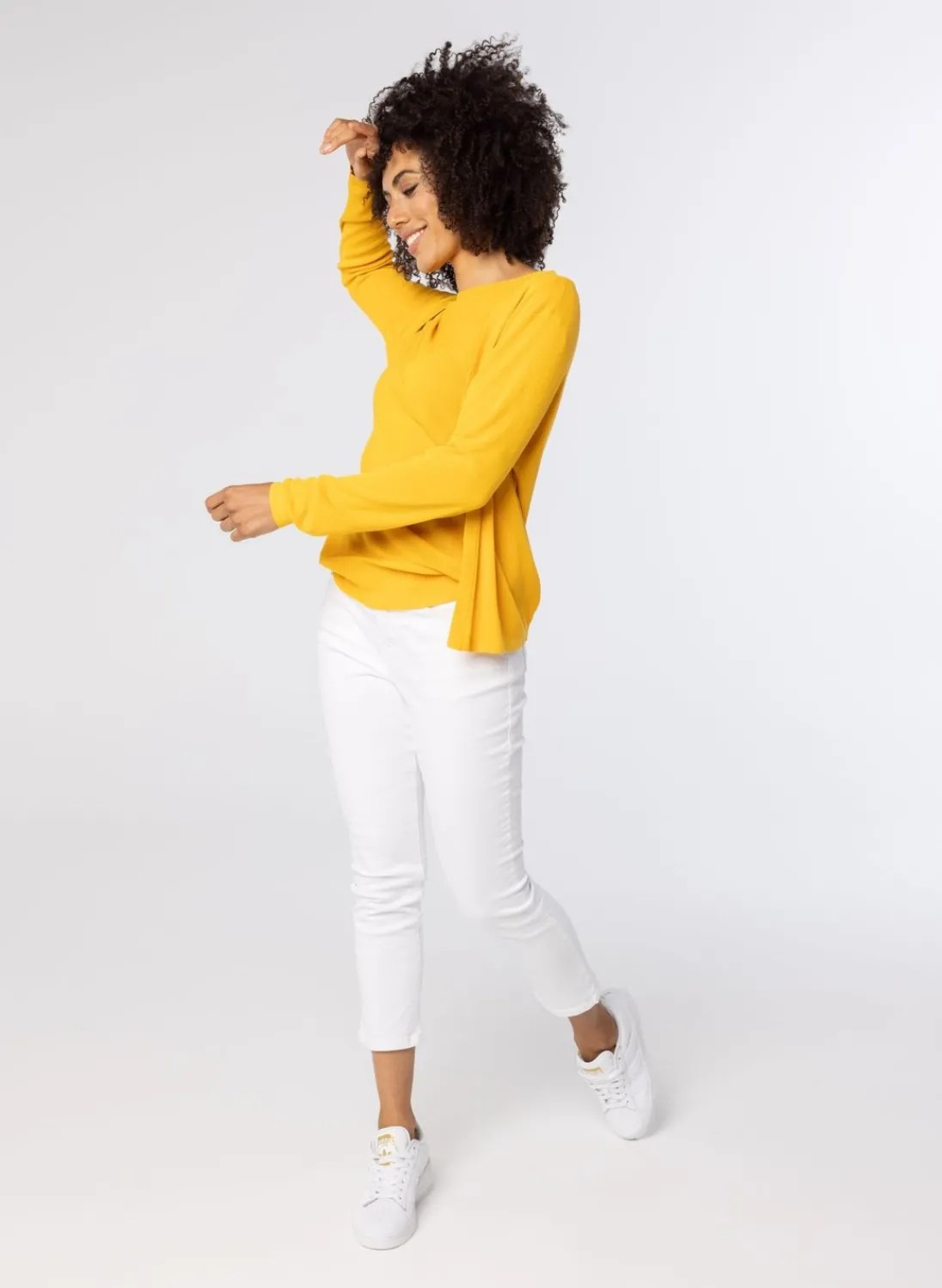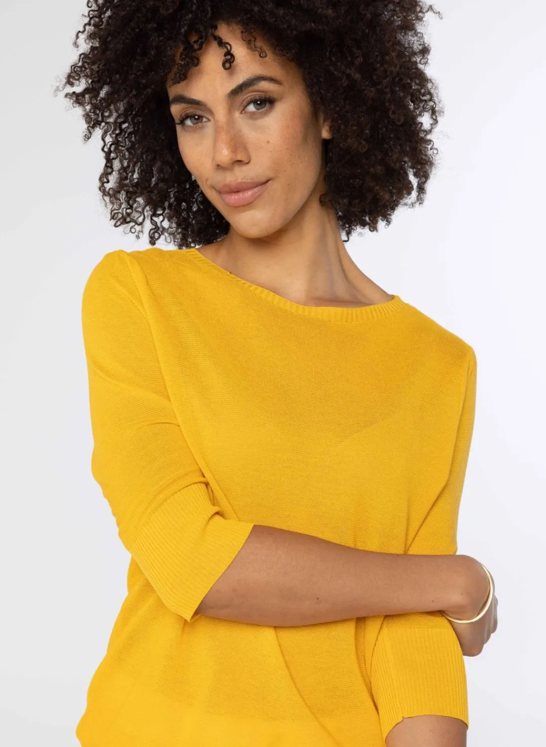Een Voile Fijngebreide Trui Met Een Wijde Ronde Halslijn En Halflange Mouwen. De Trui Heeft Plooien Bij De Mouwaanzet En Een Geribbeld Manchet. Bij Deze Trui Hoort Een Bijpassend Vest, Deze Vind Je Hier.
