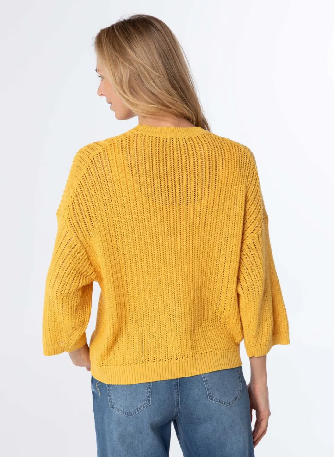 Een Grof Gebreide Trui Met Een Ronde Hals En Driekwart Mouwen, Afgewerkt Met Een Boord. Door De Trui Heen Is Een Gouden Draad Geweven, Wat Een Mooi Glinsterend Detail Geeft. De Trui Heeft Een Comfortabele Pasvorm En Voelt Heerlijk Zacht Aan Op De Huid. Perfect Voor Die Koude Winterdagen Wanneer Je Warm En Stijlvol Wilt Blijven. De Subtiele Glinstering Van Het Gouden Draad Voegt Een Vleugje Luxe Toe Aan Je Outfit, Waardoor Je Opvalt In Elke Gelegenheid. Een Tijdloos Kledingstuk Dat Je Garderobe Een Elegante En Modieuze Touch Geeft.