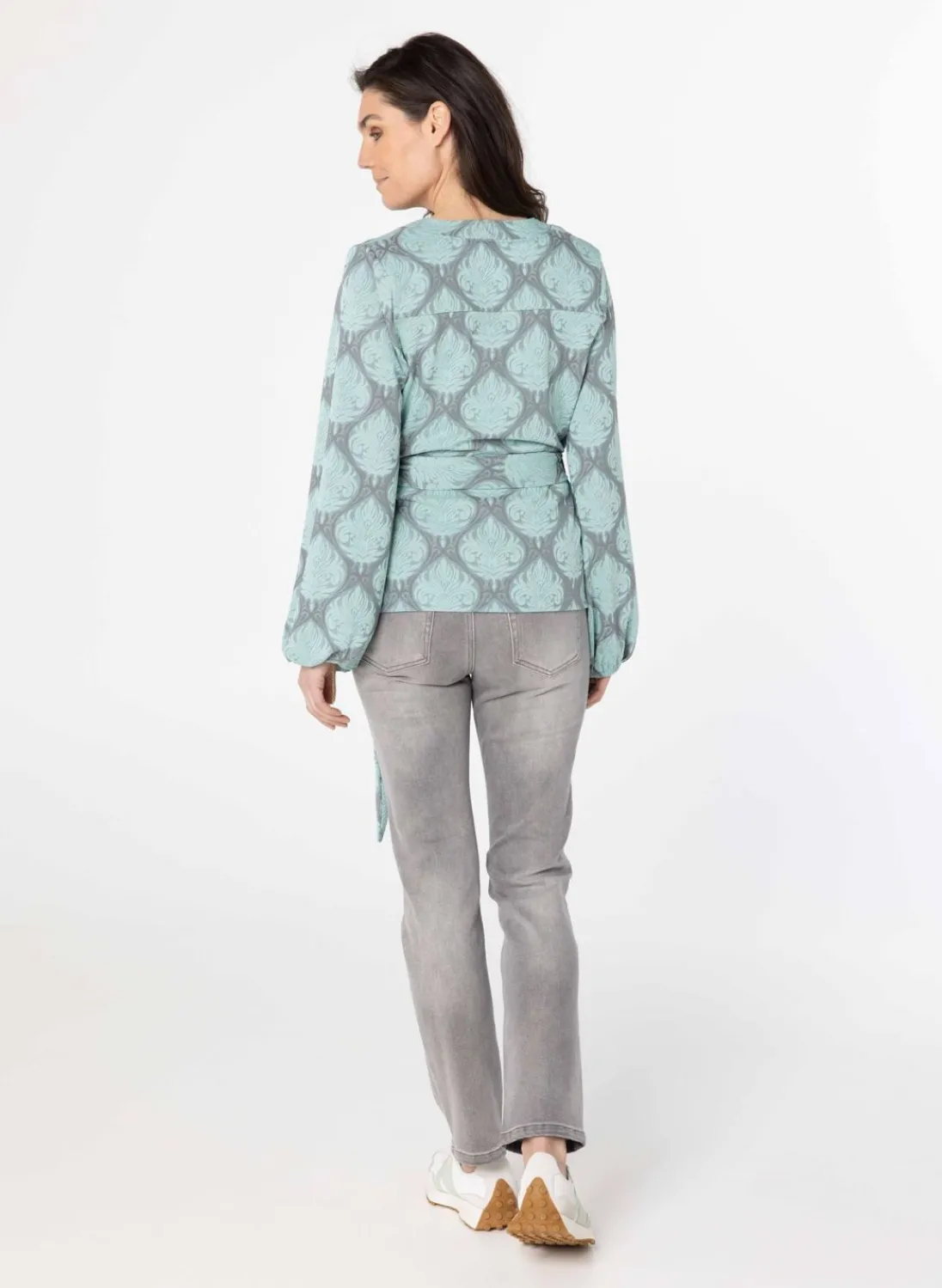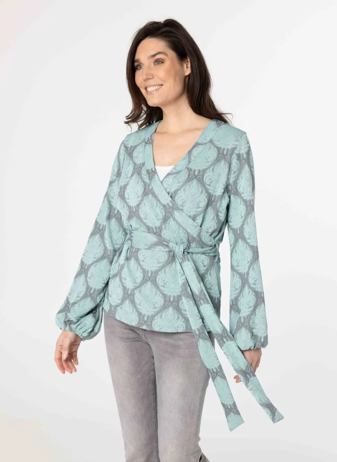 Een Vaste Overslag Trui Met Botanische Print In De Kleuren Grijs En Groen. De Overslag Trui Heeft Lange Ballonmouwen, Een Diepe V-Hals En Een Ceintuur.