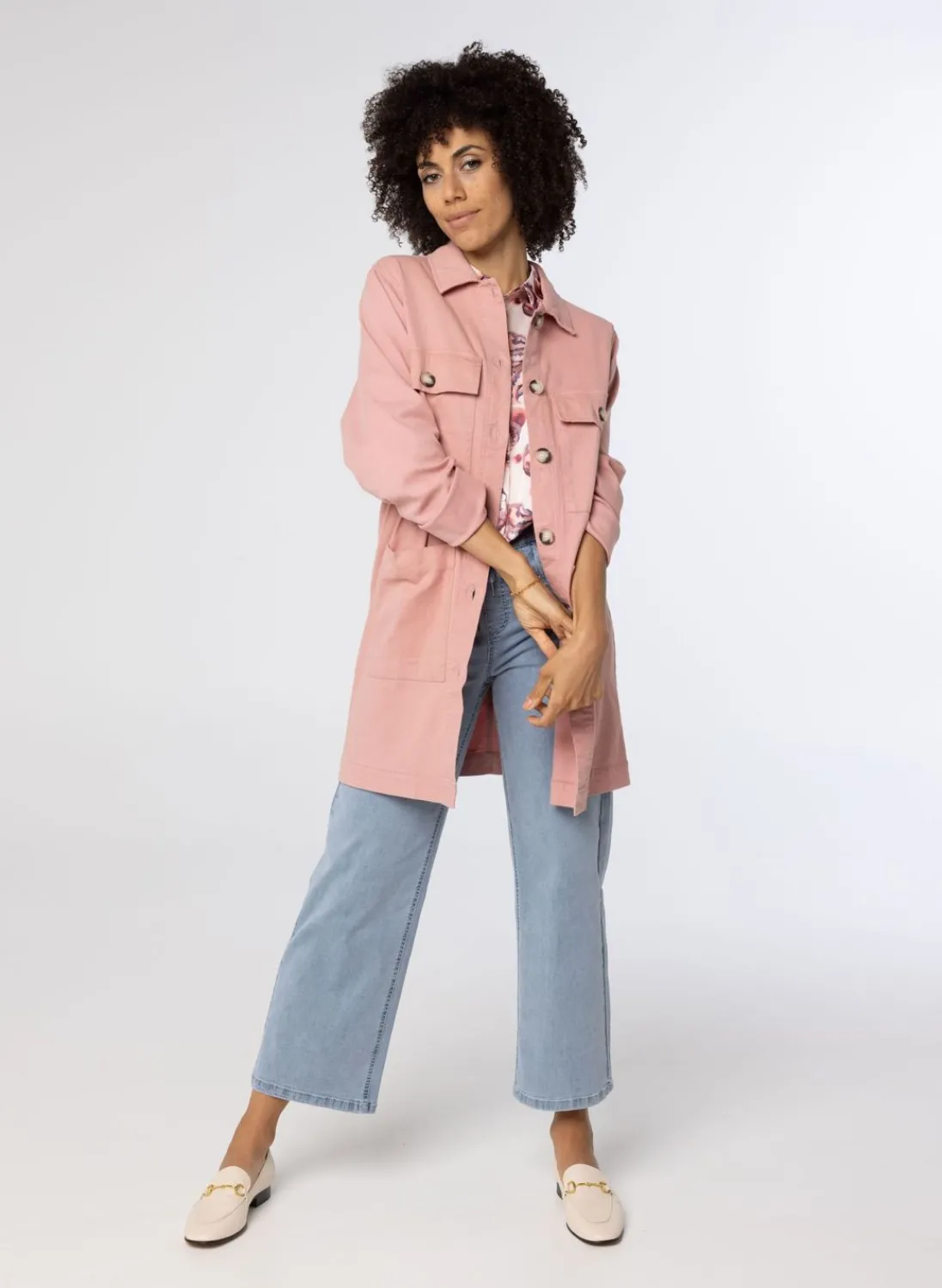 Deze Zachte Oud-Roze Spijkerjas Heeft Een Klassieke Kraag, Lange Mouwen, Twee Borstzakken Met Knoop En Twee Zakken Zonder Knoop. De Jacket Valt Tot Iets Boven De Knie, Heeft Een Knoopsluiting Van Grote Bruingemeleerde Knopen En Heeft Een Verticale Naad Op De Rug.