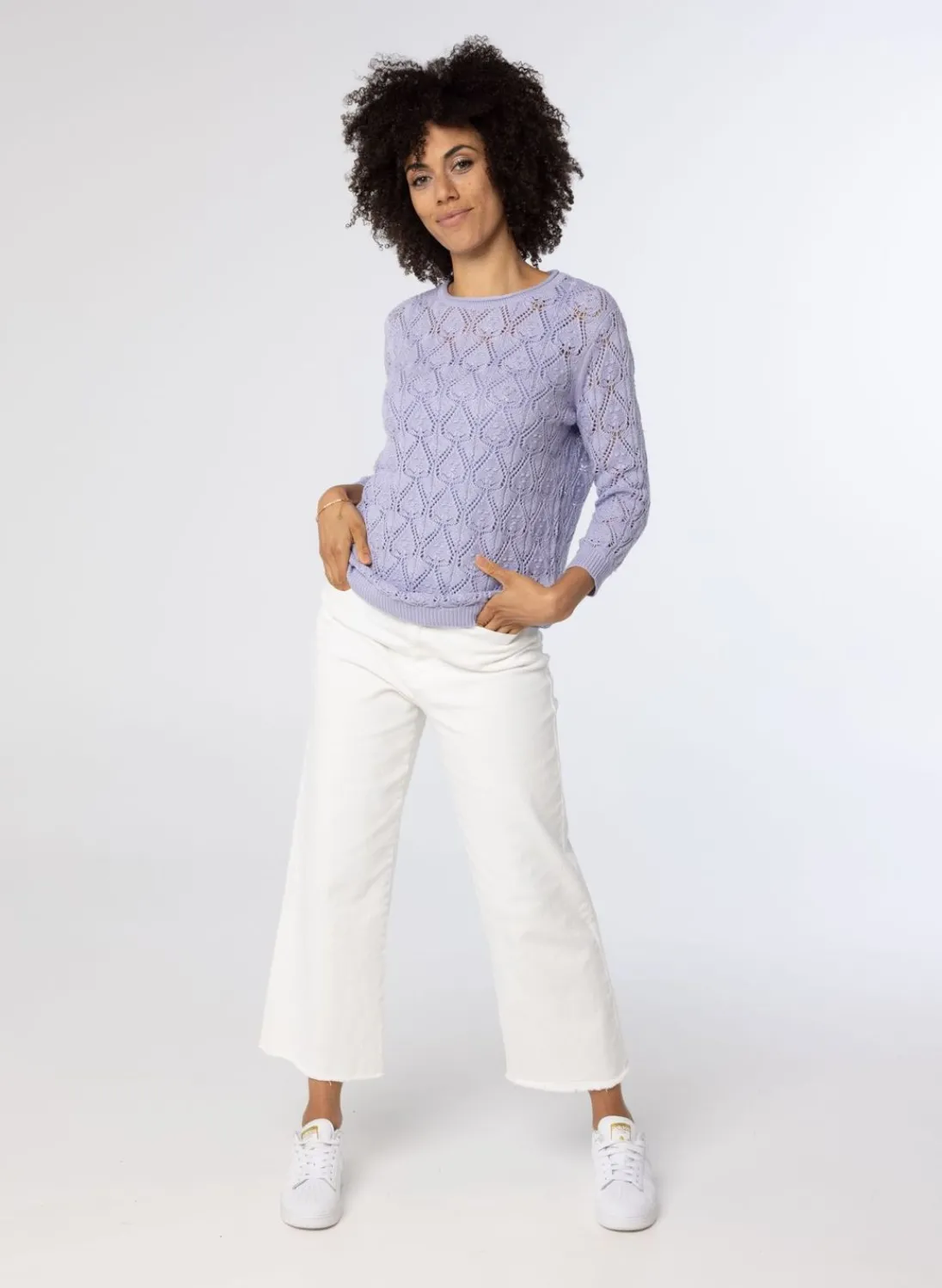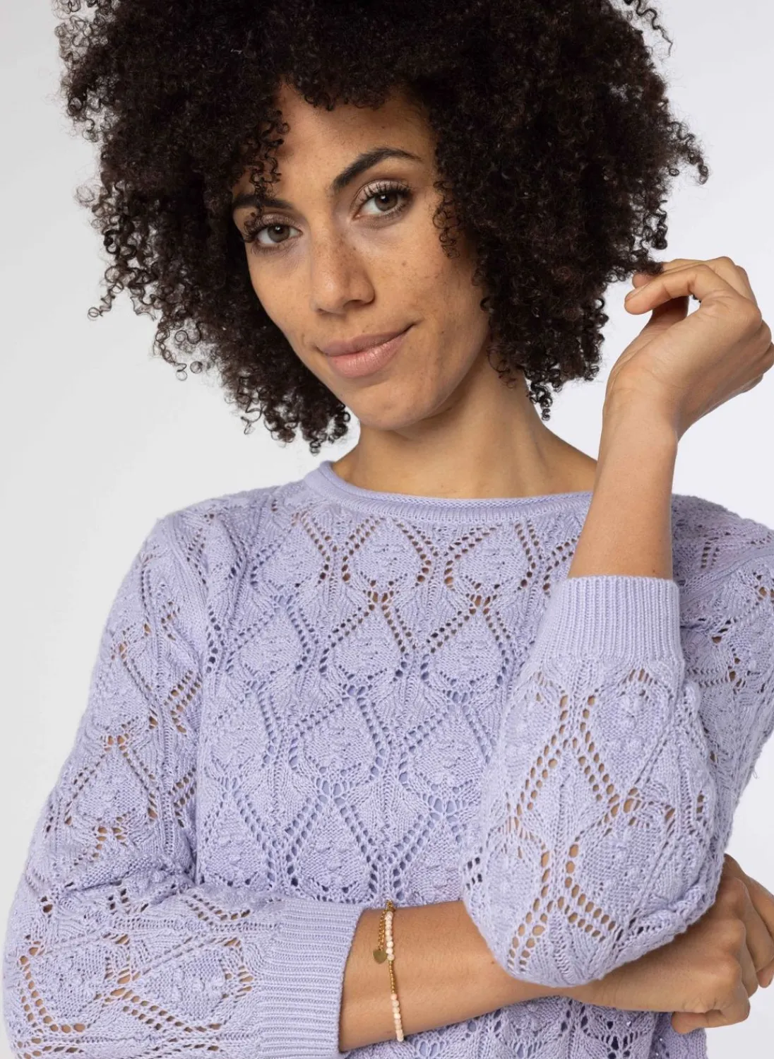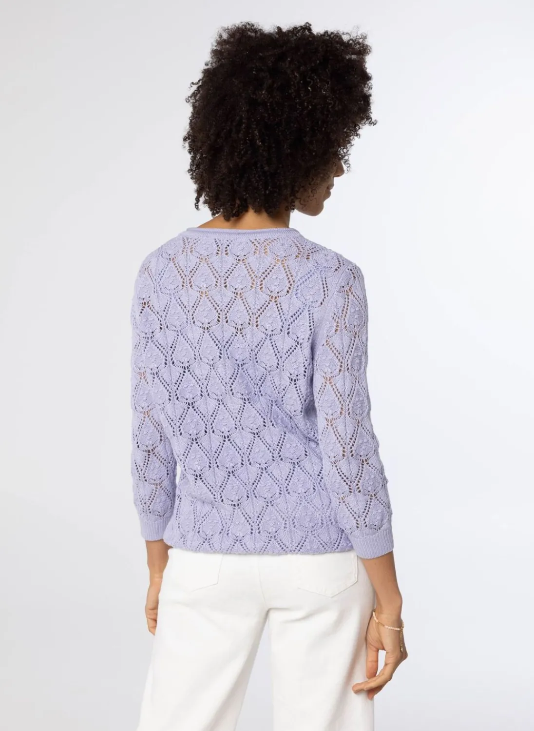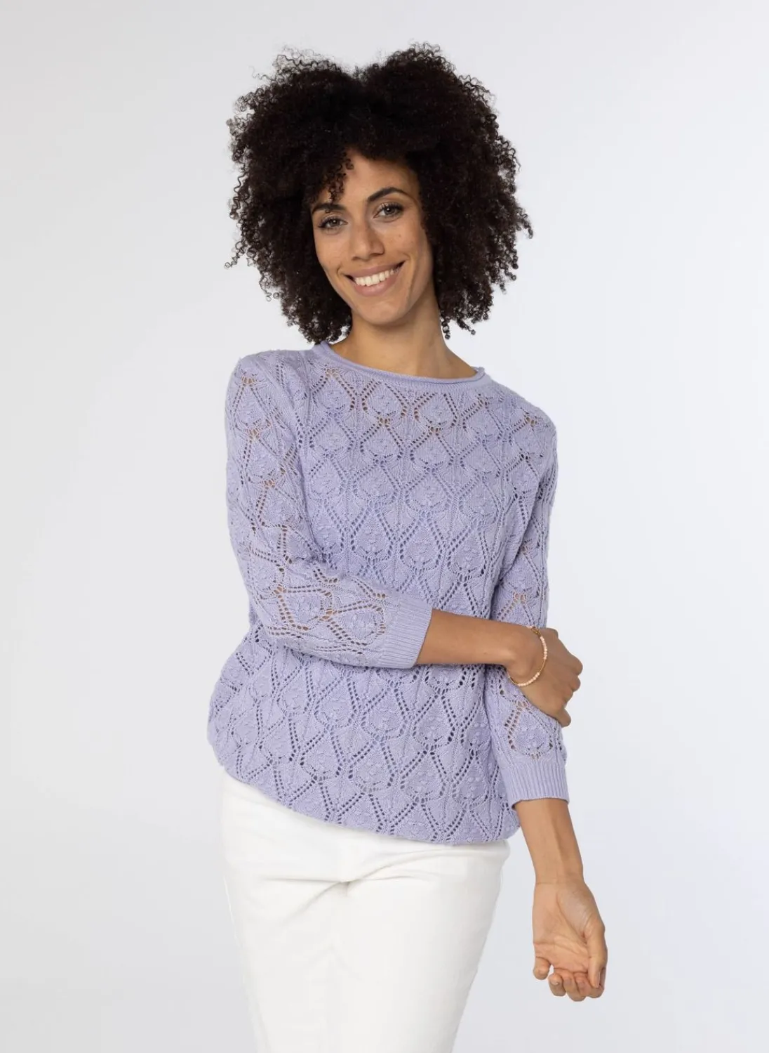 Deze Opengebreide Lila Trui Heeft Driekwart Mouwen, Een Ronde Hals En En Heeft Stretch.