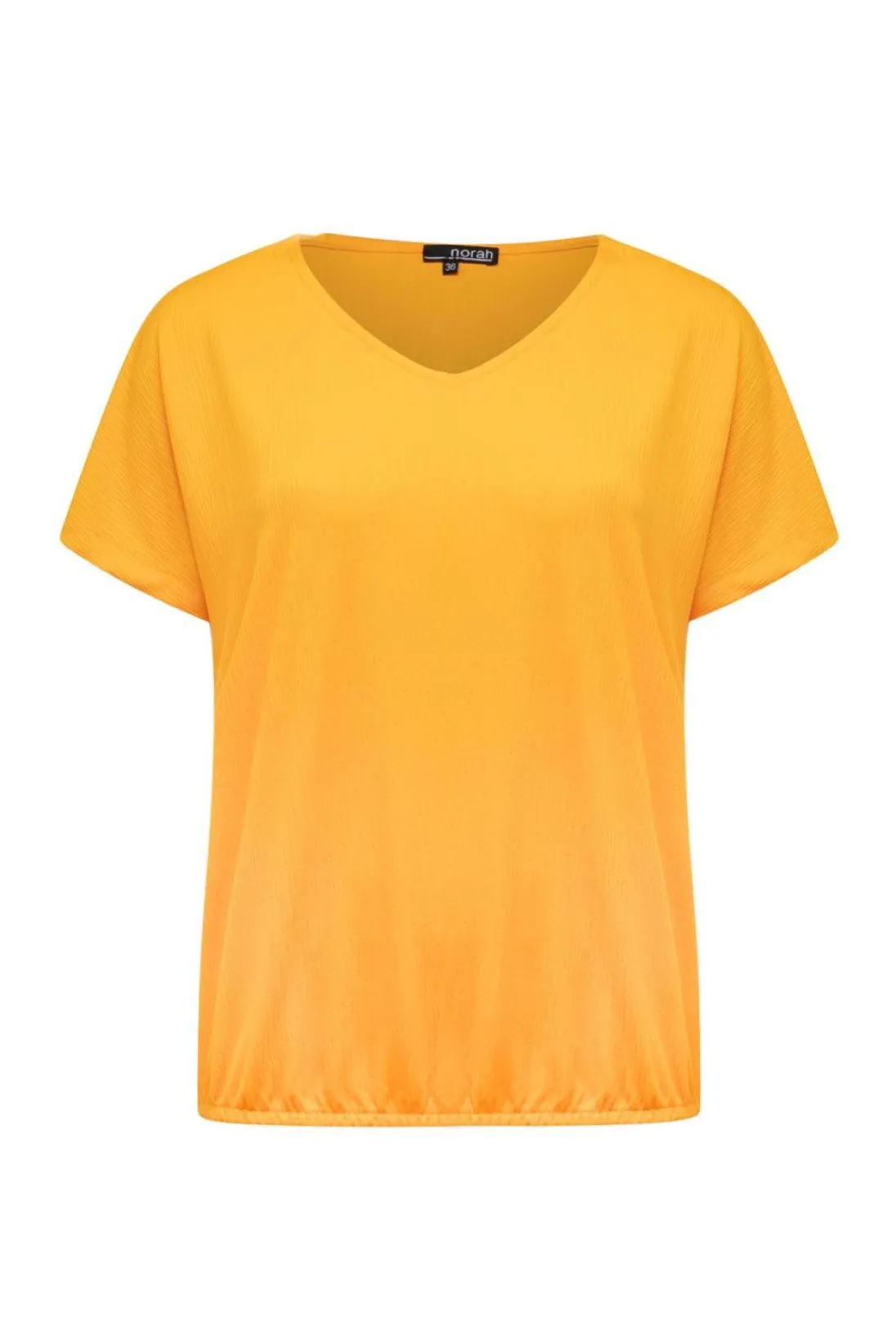 Shirt Van Mangokleur Met V-Hals En Aangeknipte Mouwen. Het Shirt Heeft Veel Stretch En Een Streeppatroon In De Effen Stof. De Elastieke Band Onderaan Zorgt Voor Een Bloezend Effect.