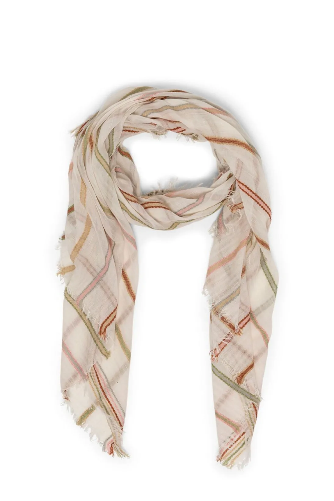 Een Prachtig Dun Geweven Sjaal, Met Een Verfijnd Motief Van Meerkleurige Strepen Die Subtiel In Elkaar Overvloeien. Deze Stijlvolle Accessoire Voegt Een Vleugje Kleur En Elegantie Toe Aan Elke Outfit. Perfect Om Je Warm Te Houden Tijdens Koele Dagen Of Om Je Look Net Dat Beetje Extra Te Geven.