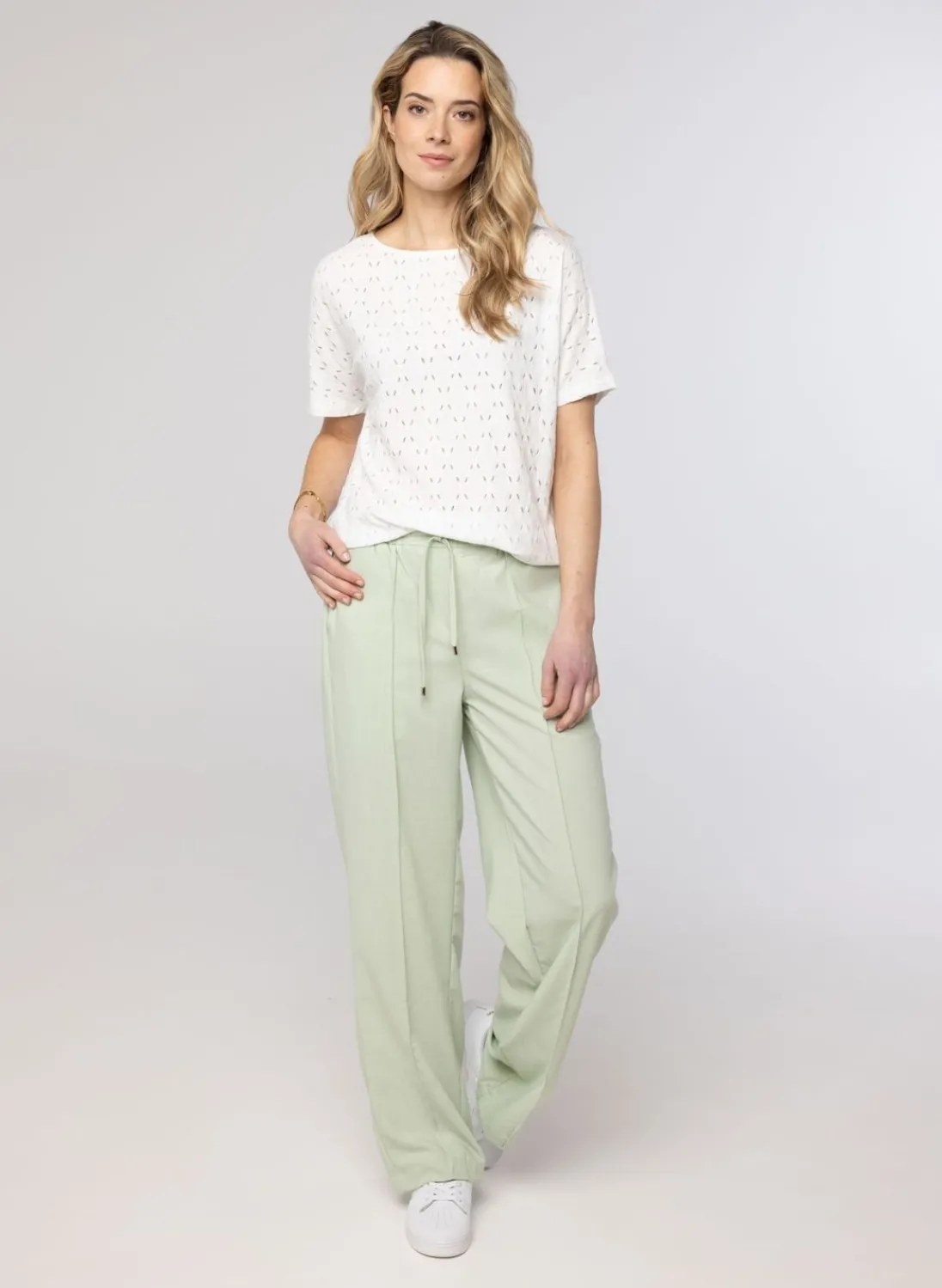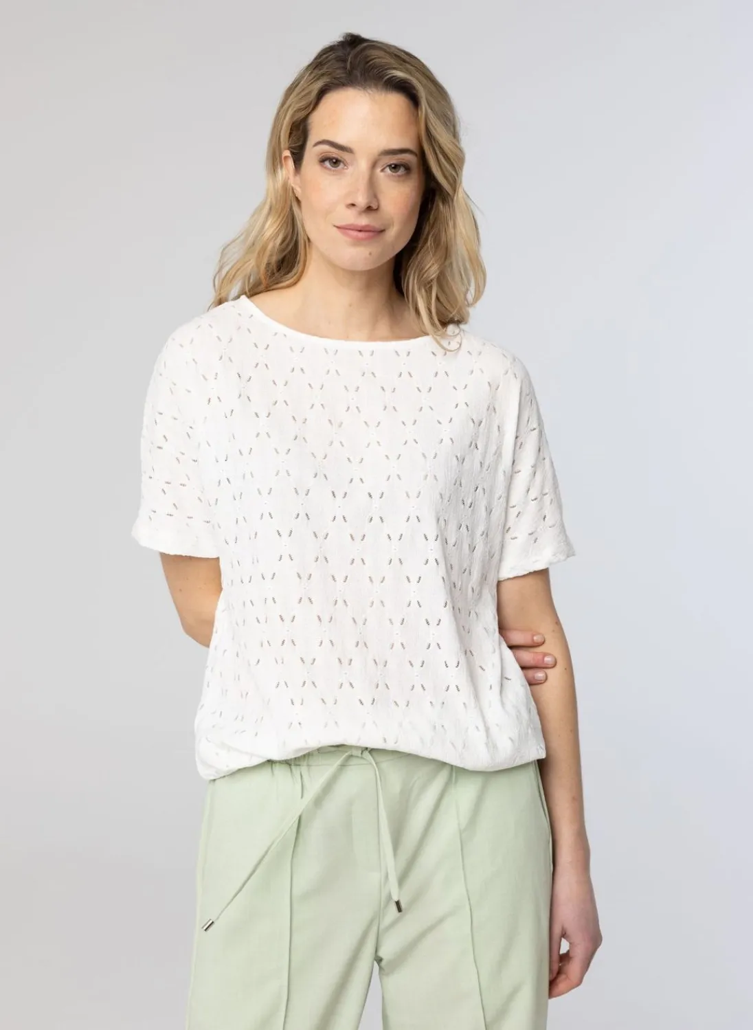 Dit Off White Shirt Met Ronde Halslijn En Aangeknipte Korte Mouwen Heeft Een Trekkoord Onder Welke Naar Wens Aangetrokken En Gestrikt Kan Worden. Daarbij Heeft Het Shirt Een Opengewerkt Patroon.