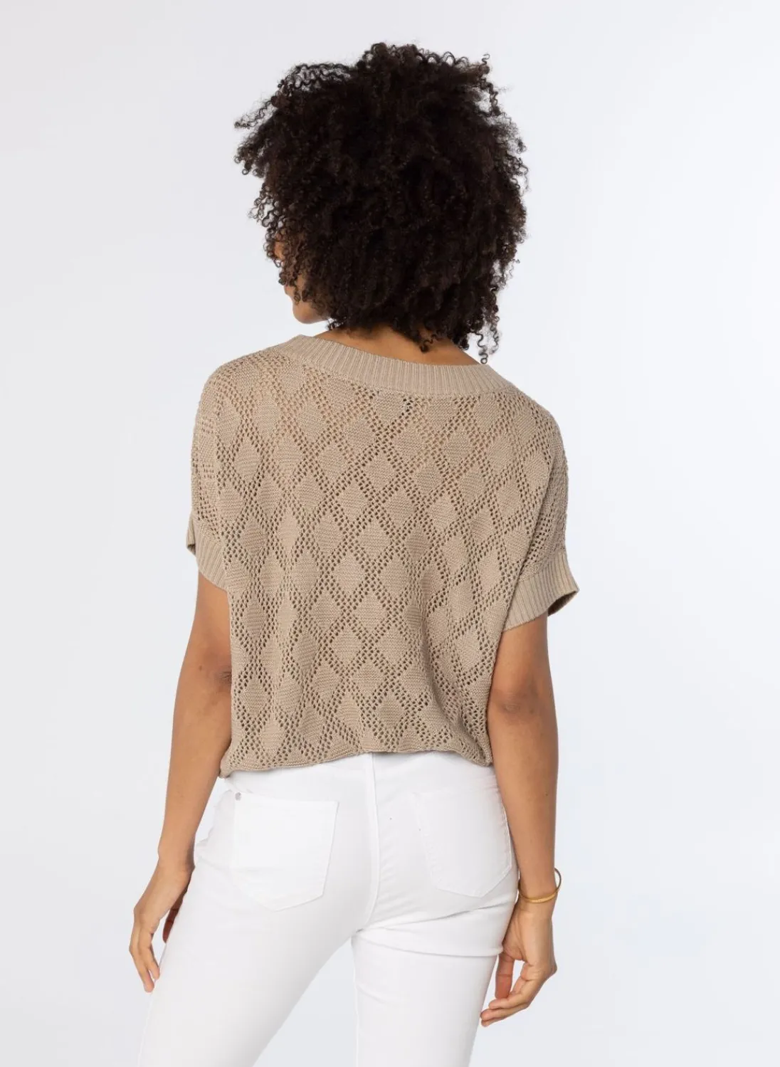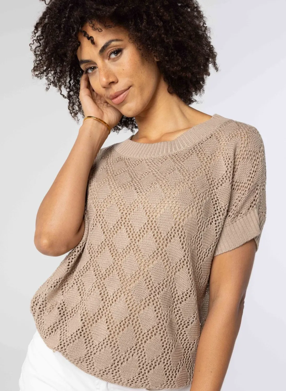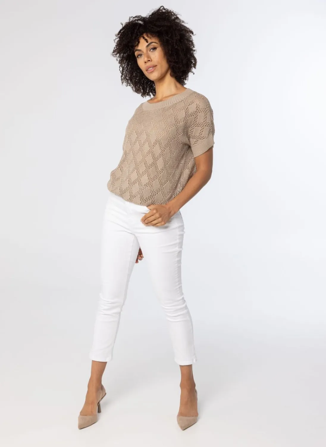 Deze Opengewerkte Gebreide Trui Met Aangeknipte Korte Mouwen Heeft Een Ruitpatroon. Op De Hals, Aan De Onderkant En Aan Het Uiteinde Van De Mouwen Is Een Gebreid Boord Van Ongeveer 2 Centimeter Gezet.