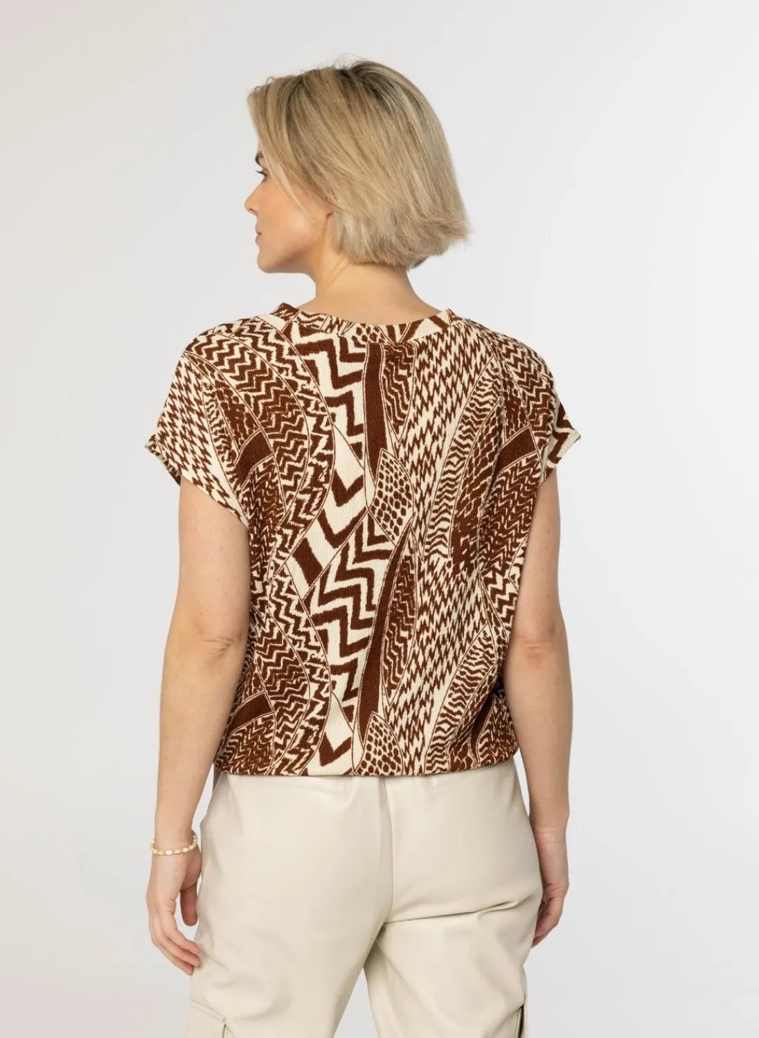 Dit Shirt Met Diepe V-Hals En Korte Aangeknipte Mouwen Heeft Een Elastieken Band Onderaan Wat Voor Een Bloezend Effect Zorgt. Dit Bruin/Ecru Shirt Is Gemaakt Van Een Crinkle Seersucker Stof En Heeft Een Grafische Print En Is Onderdeel Van Een Co-Ord Set. Maak De Set Compleet Met De Pantalon.