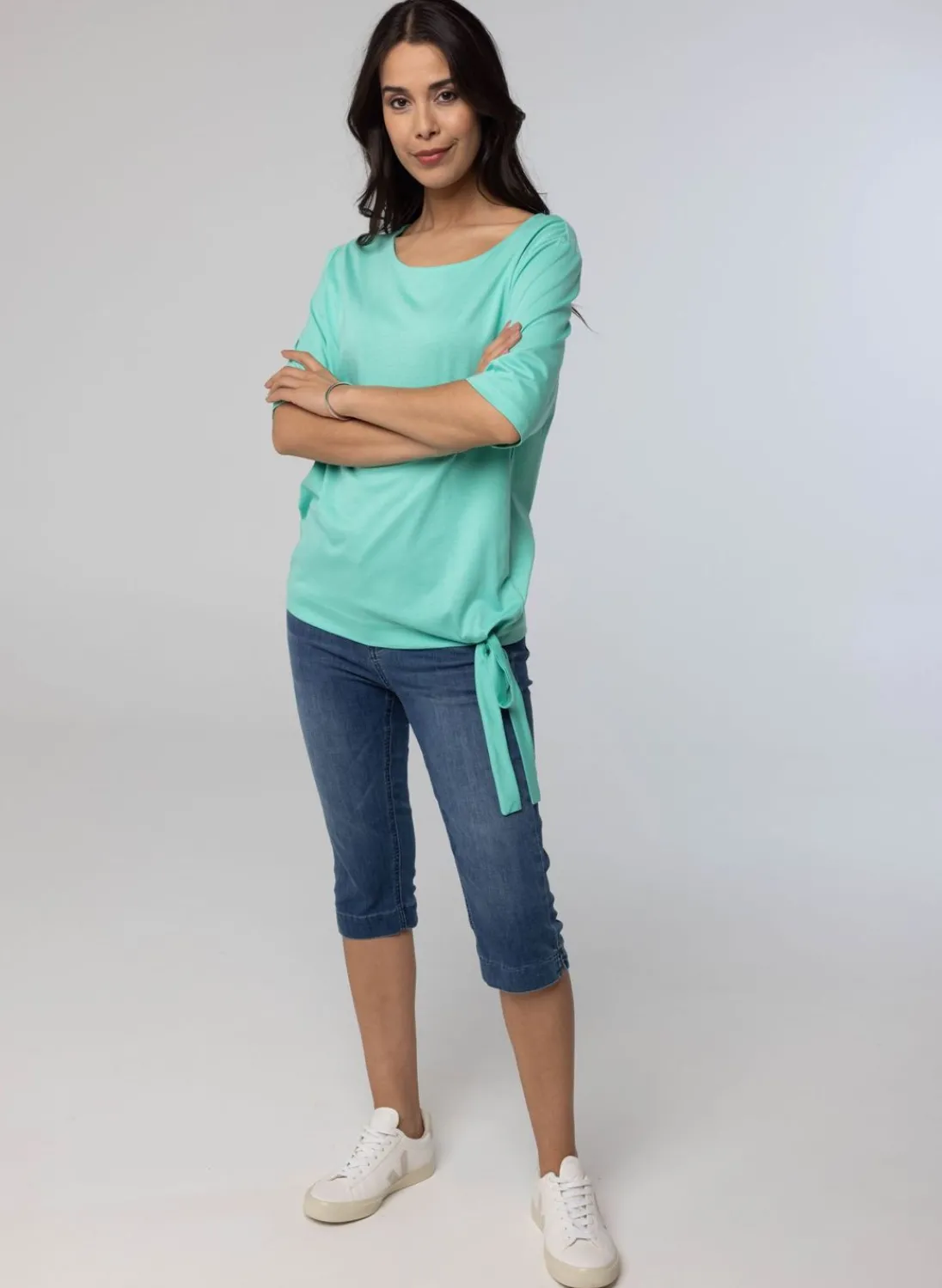 Dit Shirt Met Aangeknipte Korte Mouwen Heeft Een Strik Linksonder.