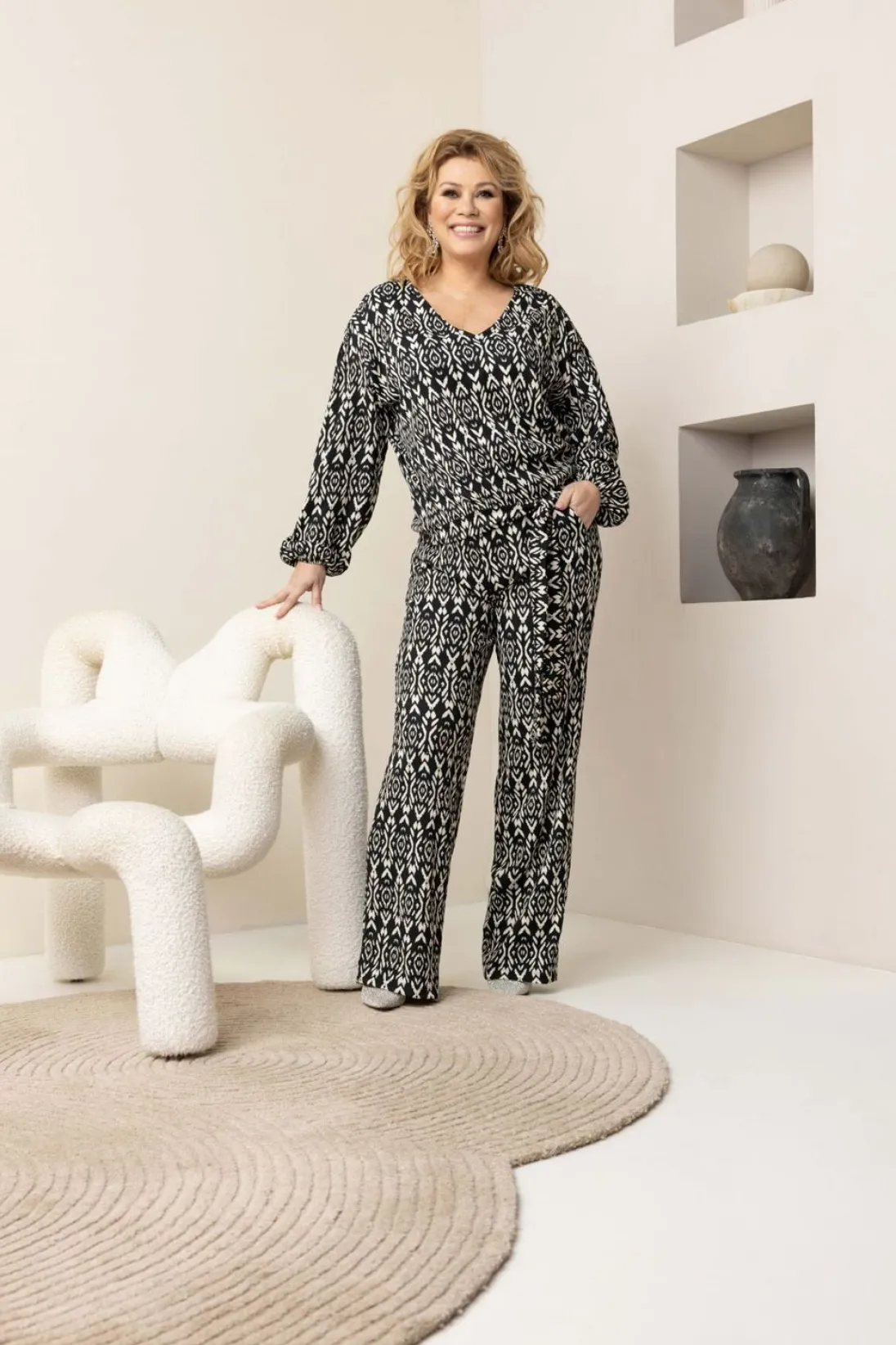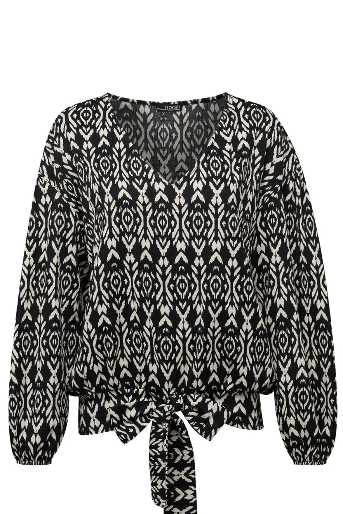 Zwart-Beige Kleurig Shirt Met Grafische Print. Het Shirt Is Elastisch En Valt Los Om Het Lichaam Heen. De V-Hals, Lange Pofmouw En Brede Band Met Strikdetail Maken Het Shirt Speels. Dit Shirt Is Te Combineren Met Een Jeans, Pantalon Of Andere Broek Van Norah. Ook Is Het Shirt Onderdeel Van Co-Ord Set. Maak De Co-Ord Set Compleet Met De Bijpassende Broek.