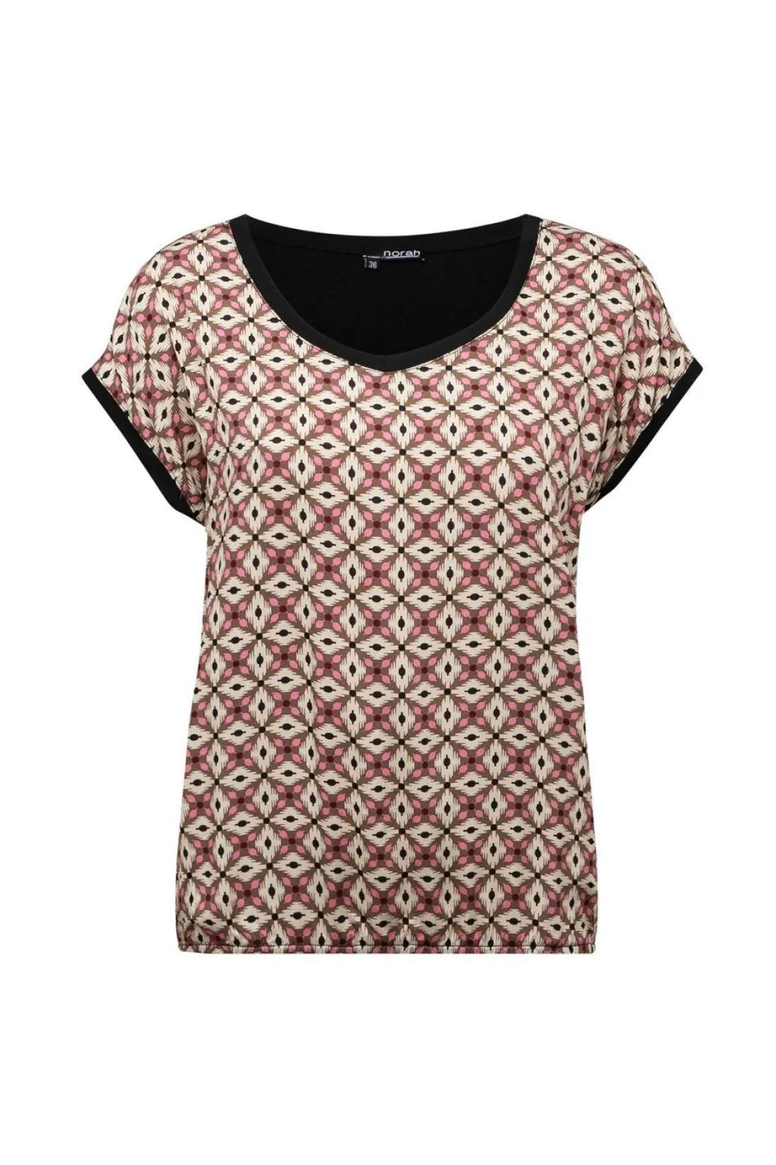 Een Meerkleurig Shirt Met Grafische Print, Korte Aangeknipte Mouw En V-Hals. De Achterzijde Van Het Shirt Is Effen Zwart. Onderaan Het Shirt Zit Een Elastieken Band Welke Voor Een Poffend Effect Zorgt. In Dezelfde Print Hebben We Een Blouse Met Lange Mouwen En Koordjes.