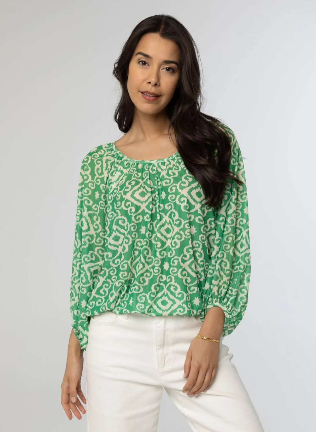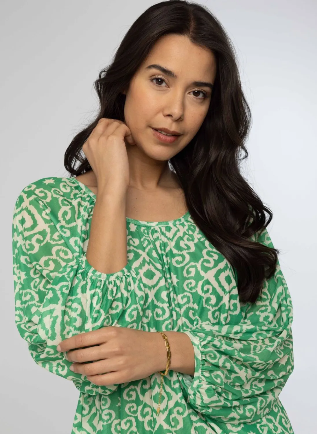 Dit Voile Groene Shirt Met Grafisch Design Heeft Een Geplooide Ronde Halslijn, Halflange Pofouwen En Veel Stretch. De Elastieken Band Op De Heupen En Aan De Uiteinden Van De Halflange Mouwen Geven Het Shirt Een Poffend Effect.