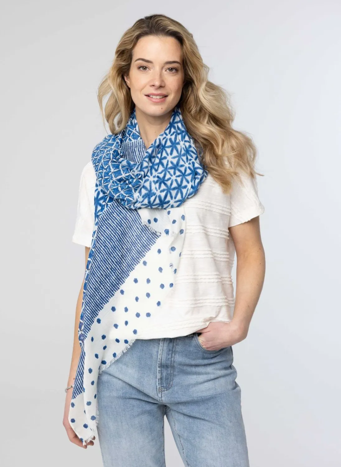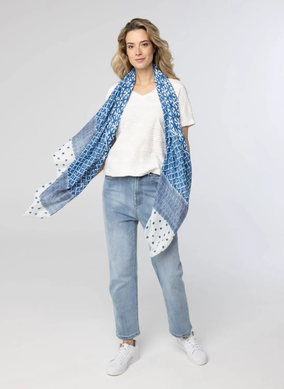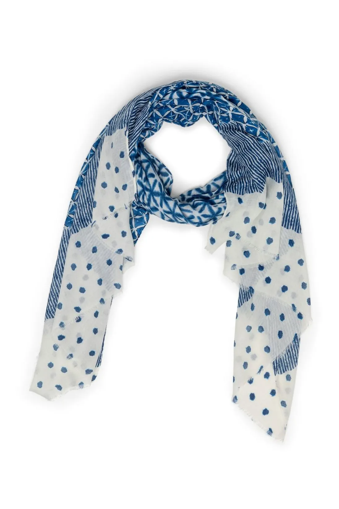 Een Dungeweven Sjaal Met Diverse Grafische Prints In De Kleuren Blauw En Ecru.