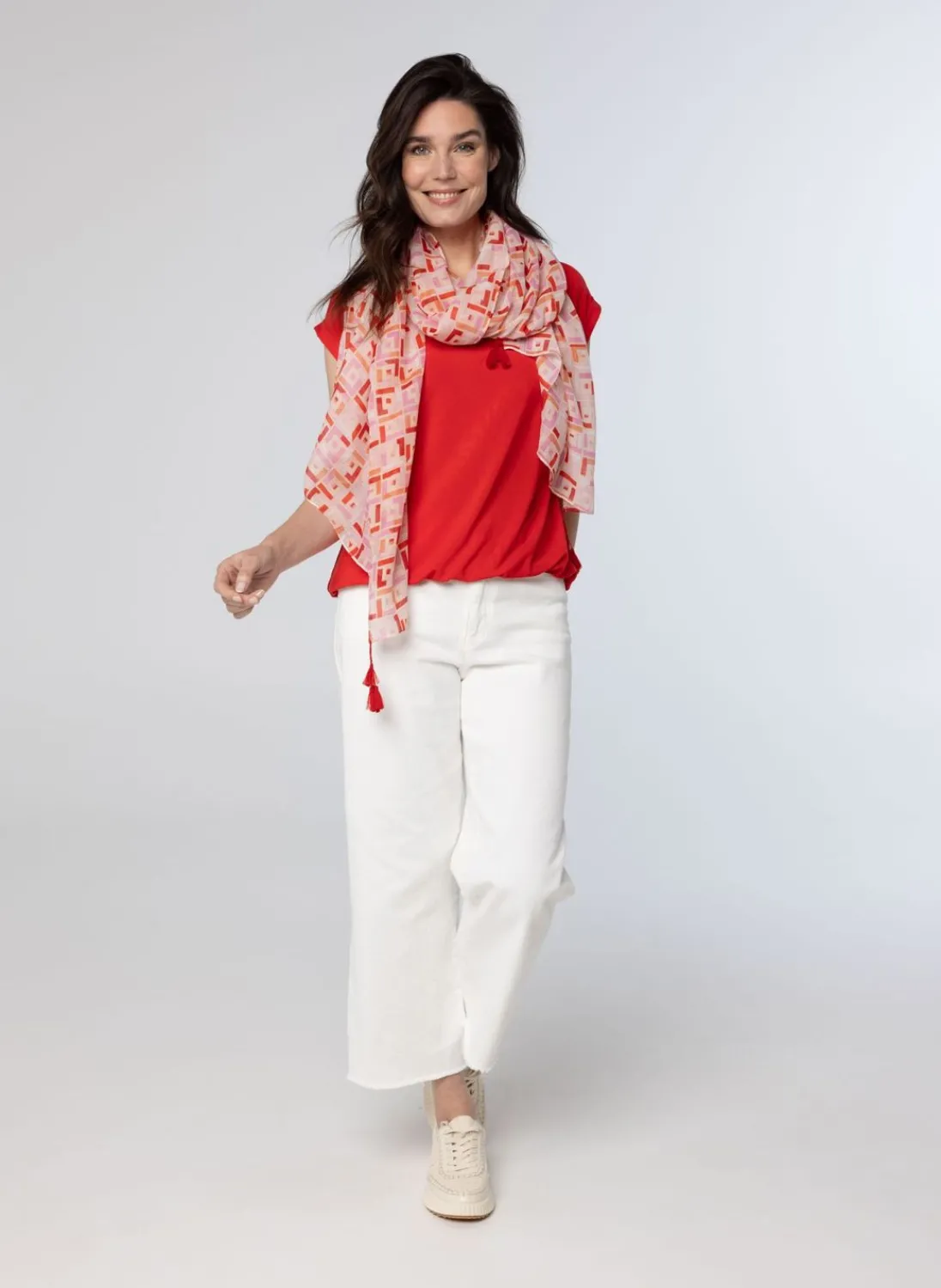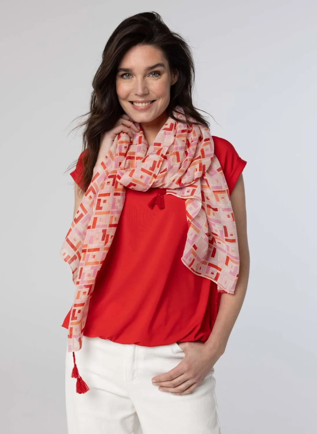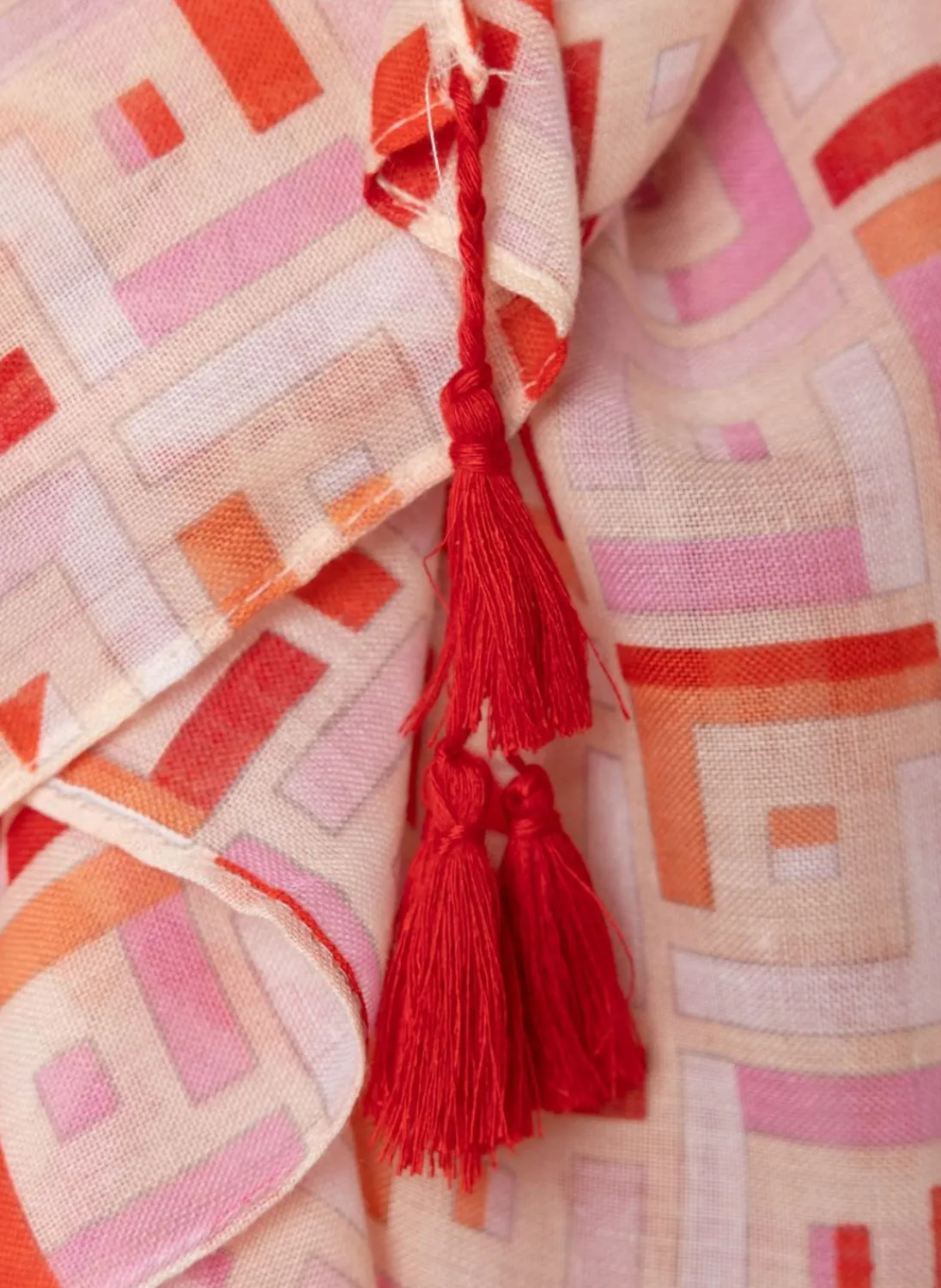 Deze Dun Geweven Sjaal Met Rood, Ecru, Wit, Oranje En Roze Heeft Rode Tassels En Een Grafische Print.