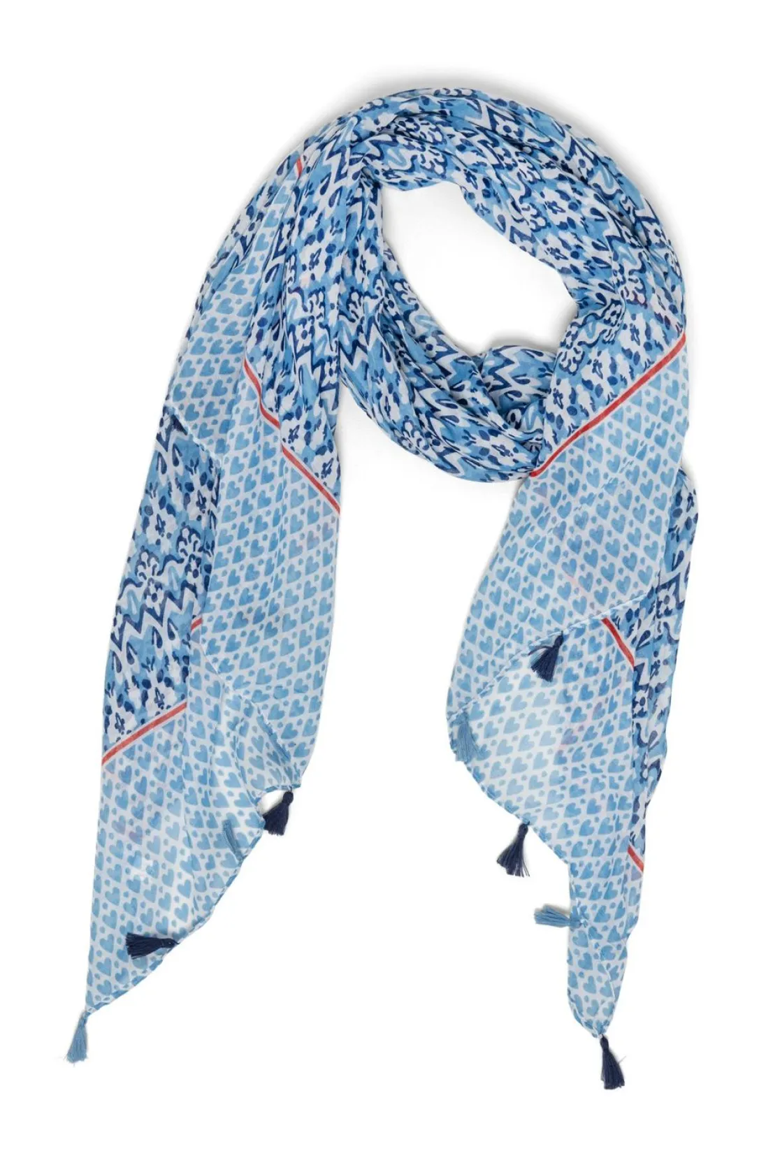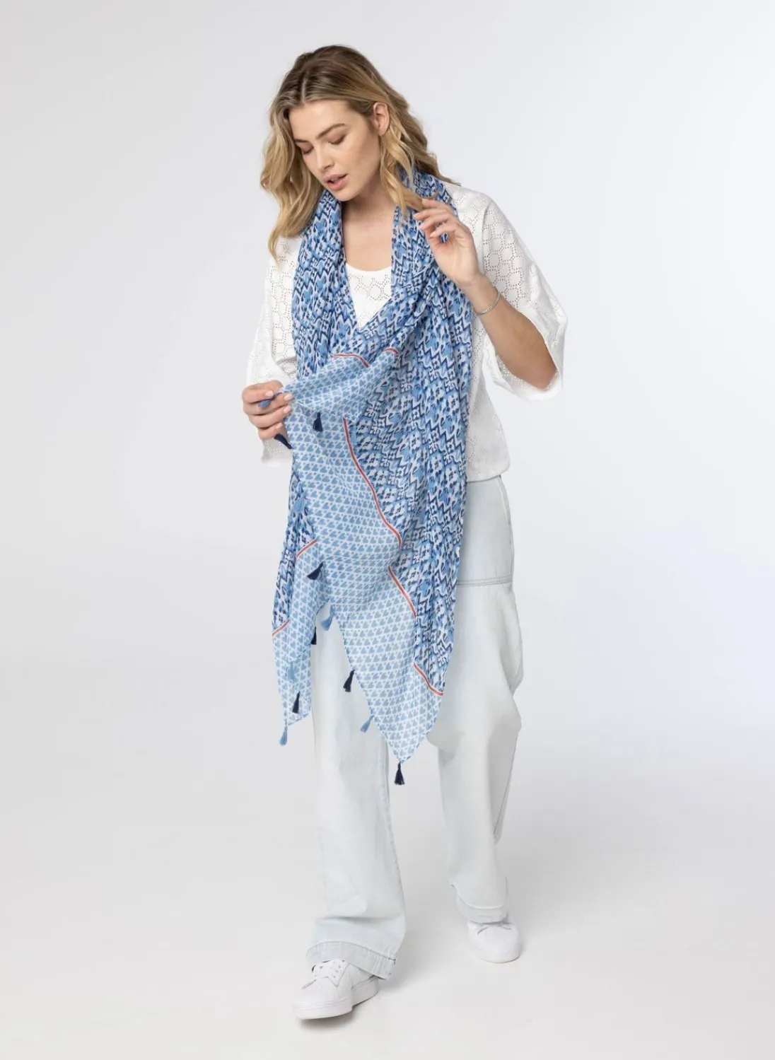 Blauwe Dungeweven Sjaal Met Diverse Grafische Prints En Tassels.