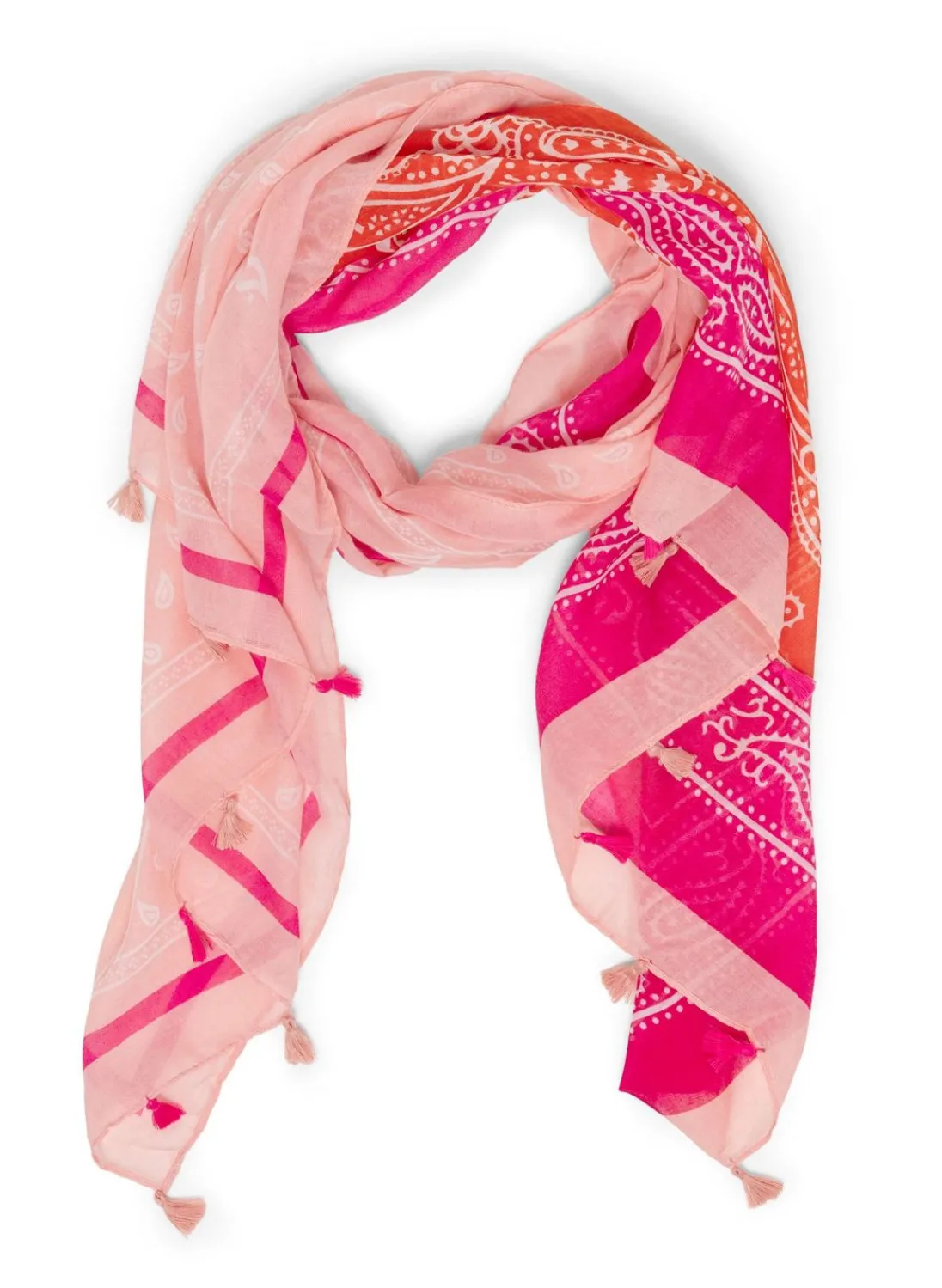 Deze Dun Geweven Sjaal Met Oranjerode, Lichtroze En Donkerroze Kleur Heeft Tassels En Een Grafische Print.