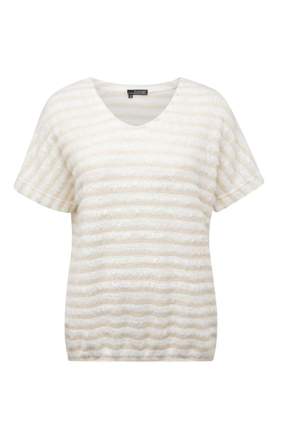 Een Gebreide Fluffy Truimet Strepen, Een V-Hals En Korte Mouwen. De Trui Is Aan De Onderkant Afgewerkt Met Een Elastische Band Wat Een Mooi Blousend Effect Geeft.