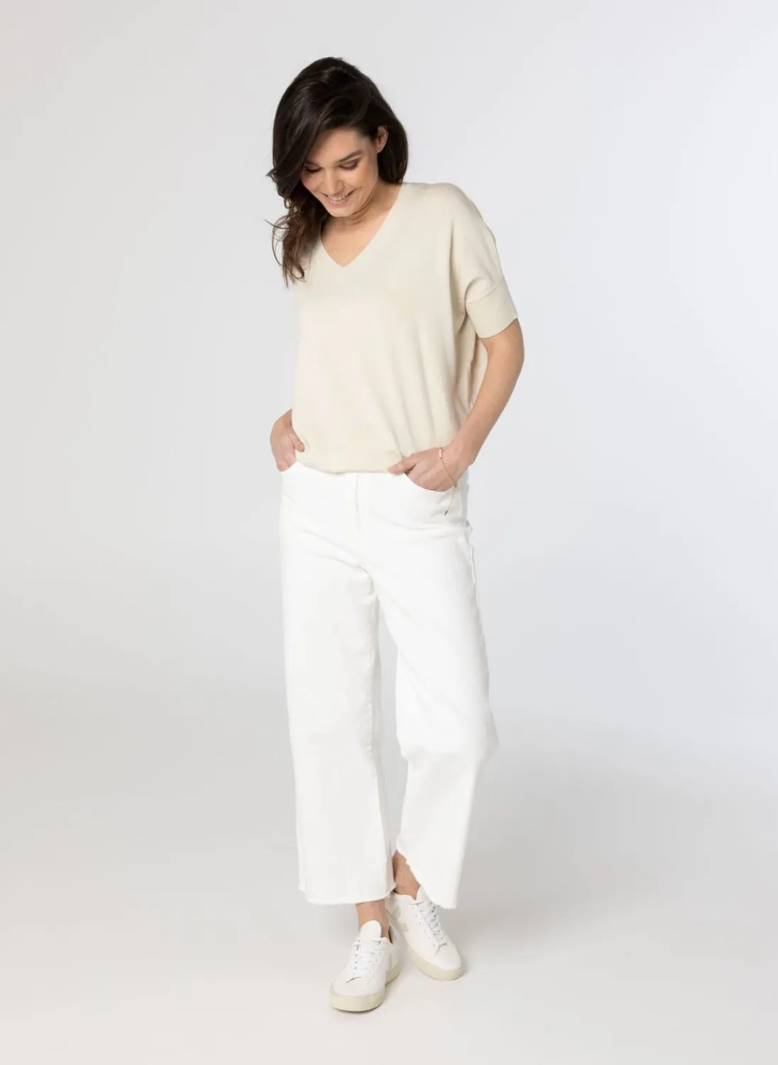 Fijn Gebreide Trui Met Een V-Hals En Korte, Aangeknipte Mouwen Met Een Boord.