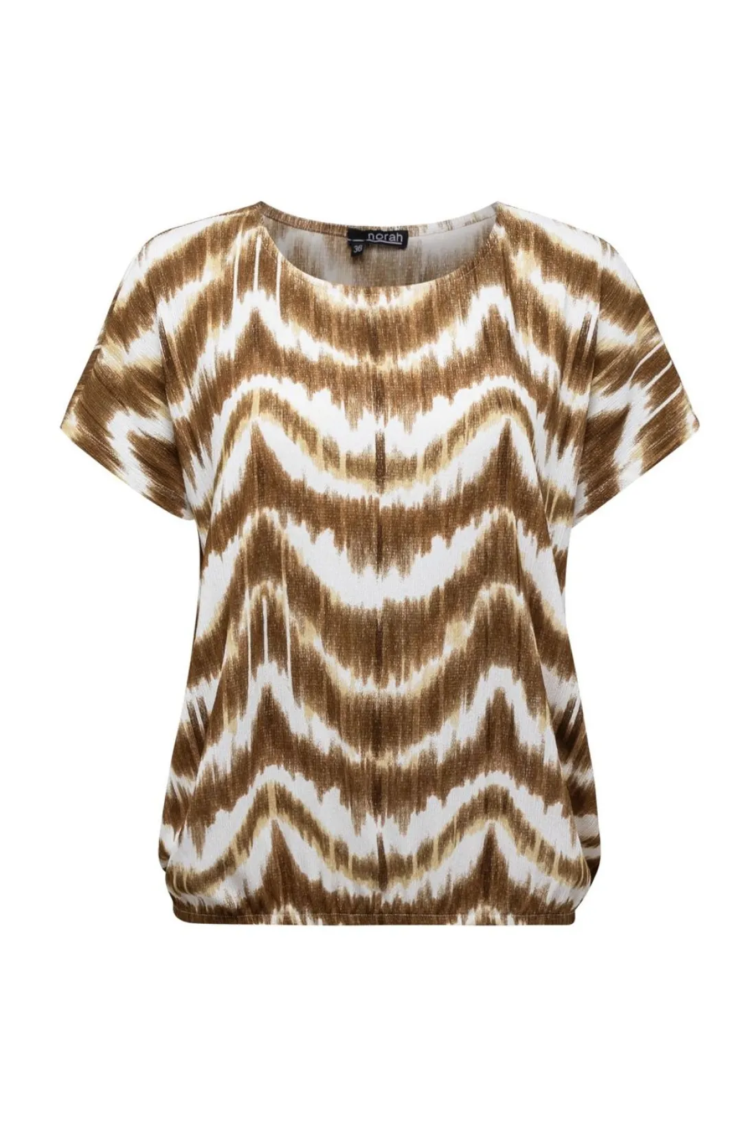 Dit Shirt Met Grafische Print In De Kleuren Bruin En Wit Heeft Een Ronde Halslijn, Aangeknipte Korte Mouwen En Een Elastieken Band Onderaan. Het Shirt Heeft Veel Stretch En Is Onderdeel Van Een Co-Ord Set. Maak Het Co-Ord Pak Af Met De Rok.