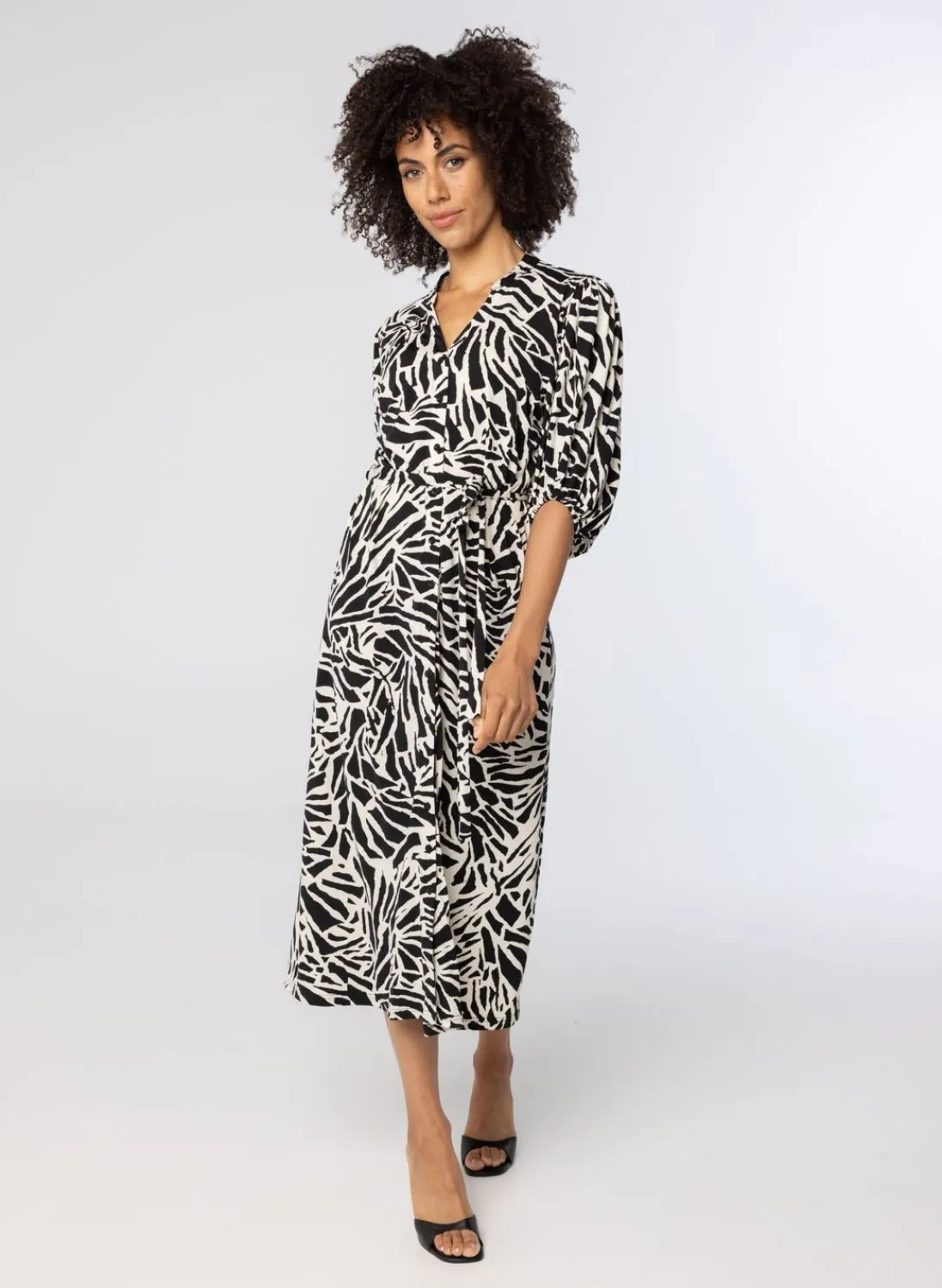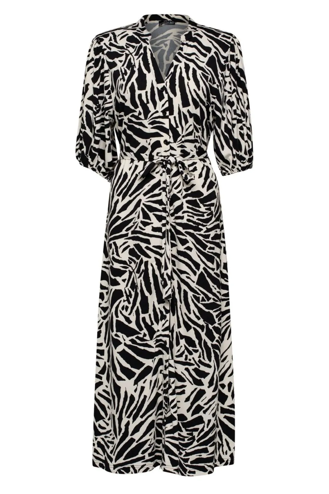 Lange Zwart-Witte Jurk Met Dierenprint. De Jurk Is Van Boven Tot Onder Voorzien Van Een Knooplsluiting. Daarnaast Heeft De Jurk Halflange Pofmouwen En Een Ceintuur.