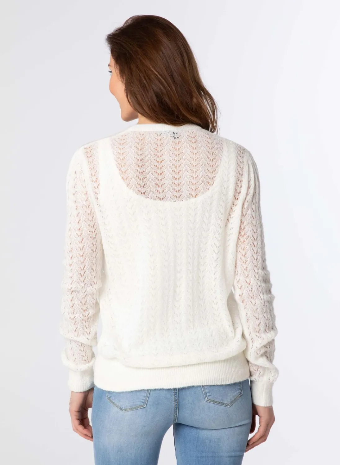 Een Zacht Vest Met Een V-Hals En Een Gebreid Patroon, Waardoor Het Vest Een Lichte, Doorschijnende Uitstraling Heeft. Bovendien Heeft Het Vest Een Knoopsluiting En Lange Mouwen Met Manchetten Voor Extra Stijl En Comfort. Het Perfecte Kledingstuk Om Elke Outfit Een Vleugje Elegantie Te Geven.