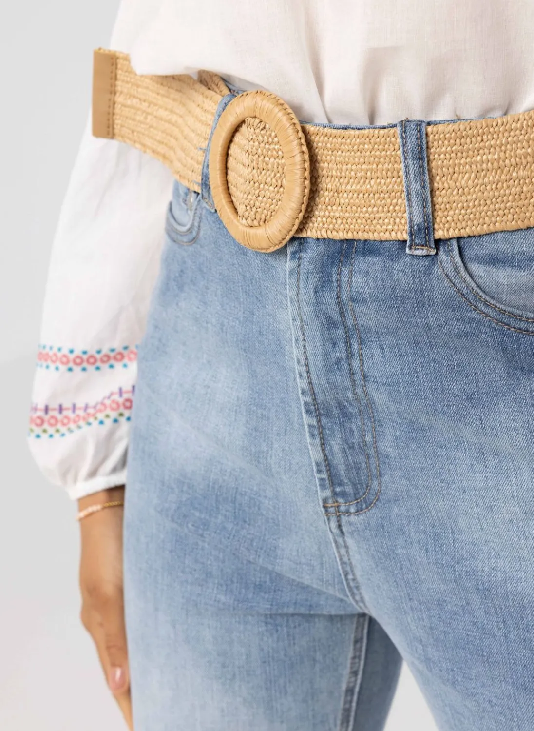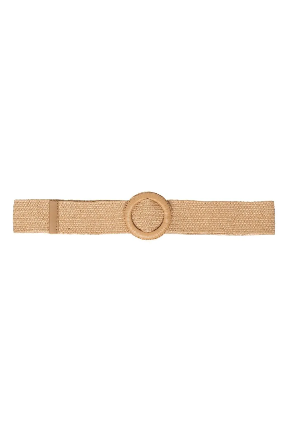 Een Zandkleurige Riem Met Rieten Look. De Ronde Gesp Heeft Dezelfde Zandkleur.