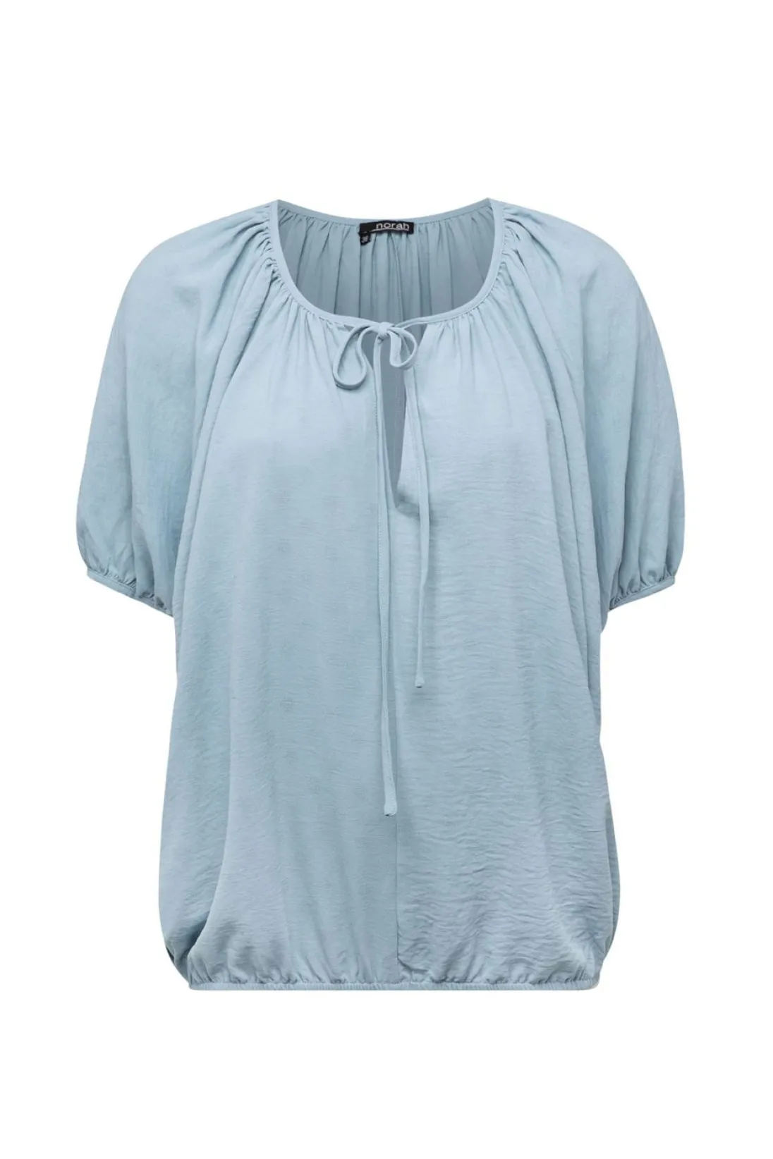 Ruimvallende Blouse Met Korte Pofmouwen. De Plooiende V-Hals Kan Gestrikt Worden Met De Koordjes. De Plooien Lopen Door In De Nek. De Elastische Band Onderaan Het Shirt Zorgt Voor Een Bloezend Effect. In De Stof Zit Een Onopvallend Stippenpatroon Verwerkt.