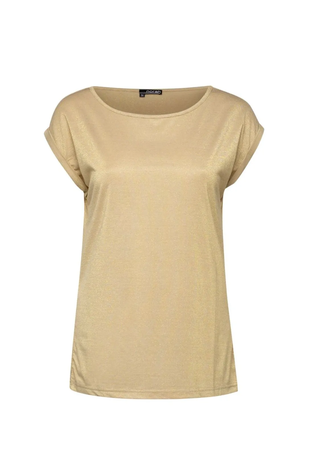 Dit Effen Shirt Met Glinsterende Gouden Details Is Zowel Feestelijk Als Casual Te Dragen. Het Shirt Heeft Een Ronde Halslijn, Omgeslagen Kapmouw, Is Zeer Elastisch En Losvallend.