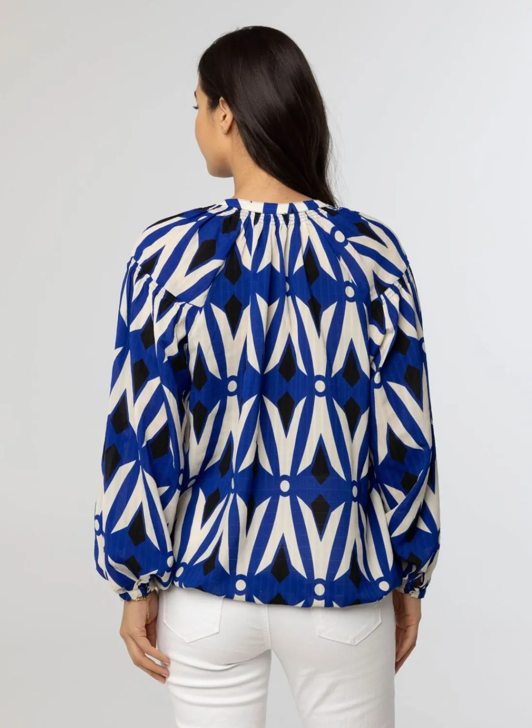 Kobaltblauwe Blouse Met V-Hals En Halve Knoopsluiting. De Blouse Heeft Een Pofmouw Met Manchet, Trekkoord En Geplooide V-Hals. In Deze Print Hebben We Ook Een Blouse Met Klassieke Kraag.