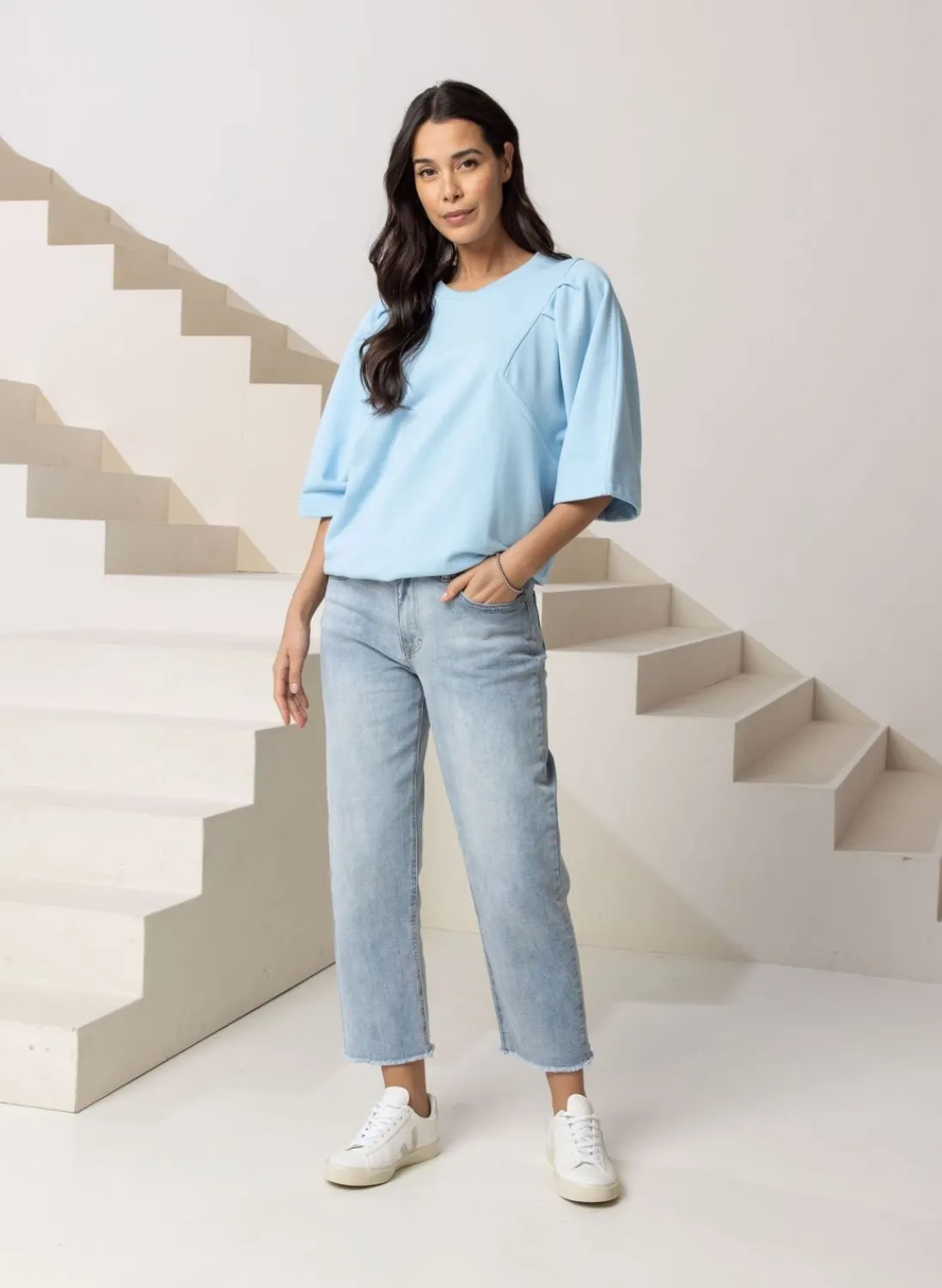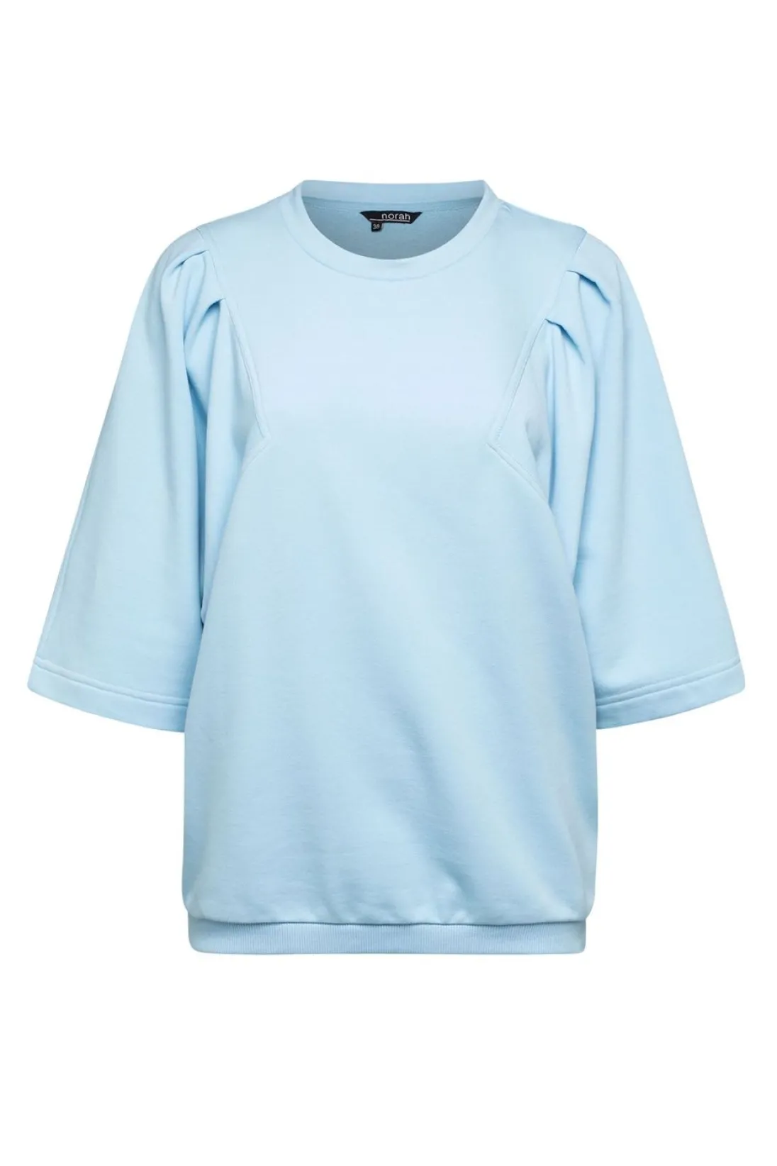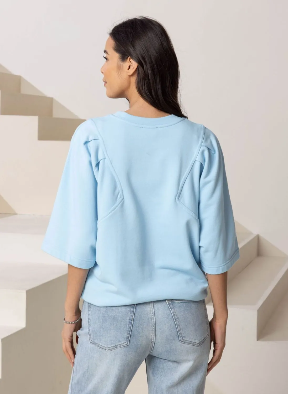 Een Lichtblauwe Trui Van Sweaterstof. Aan De Voorkant En De Achterkant Van De Trui Zijn Speelse Lijnen Toegevoegd Met Plooien. De Trui Heeft Wijd Uitlopende Korte Mouwen En Onderaan Een Ribbelband Waardoor De Trui Goed Aansluit.