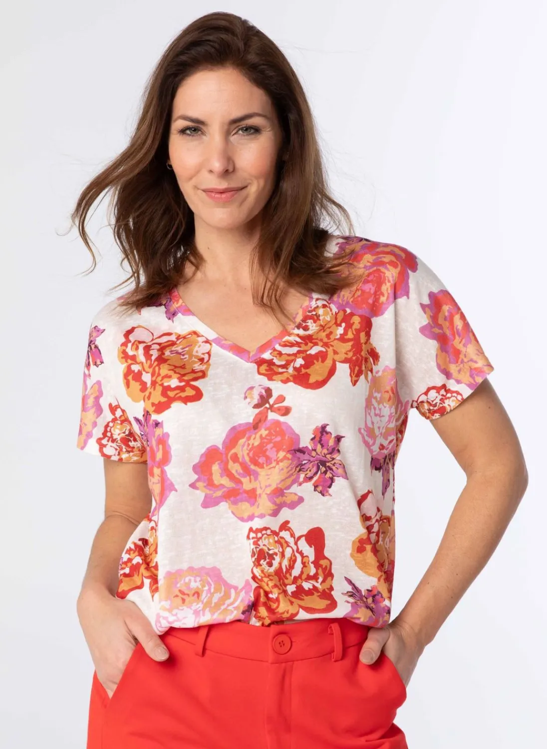 Een Prachtig Gebreid Shirt Met Een Levendige Bloemenprint. Het Shirt Heeft Een Flatterende V-Hals, Delicate Korte Mouwen En Een Licht Doorschijnende Stof Die Een Vleugje Elegantie Toevoegt. Perfect Om Een Vleugje Kleur Toe Te Voegen Aan Elke Outfit.