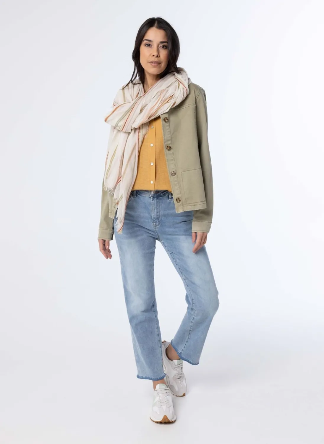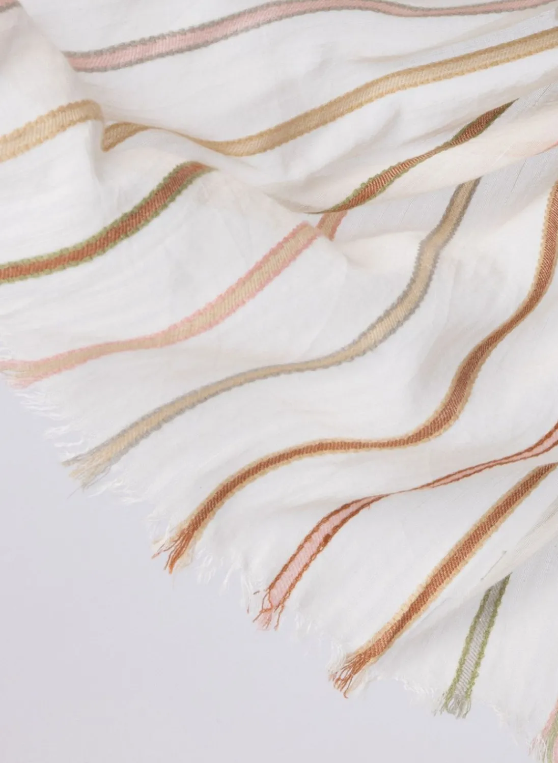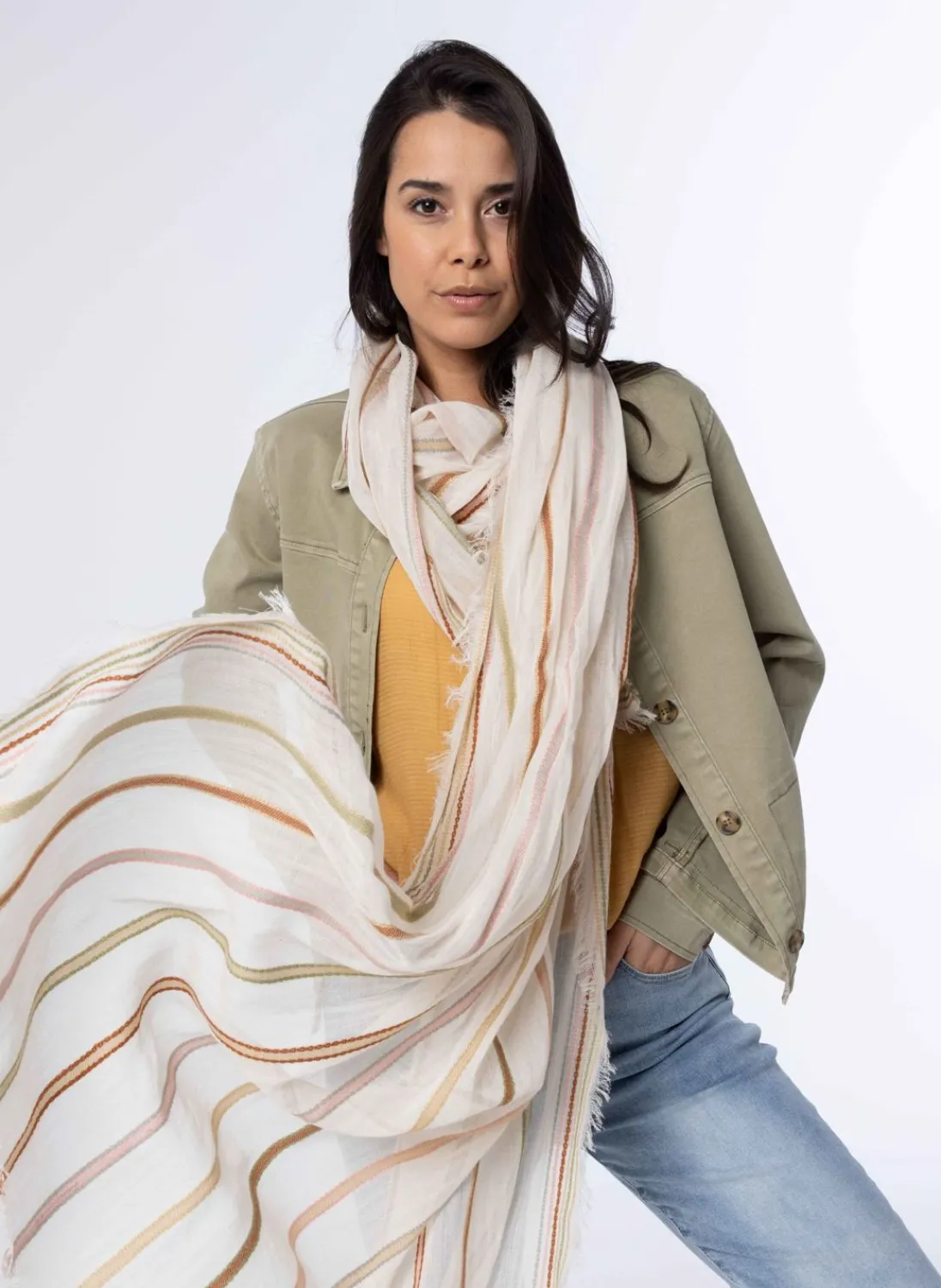 Een Prachtig Dun Geweven Sjaal, Met Een Verfijnd Motief Van Meerkleurige Strepen Die Subtiel In Elkaar Overvloeien. Deze Stijlvolle Accessoire Voegt Een Vleugje Kleur En Elegantie Toe Aan Elke Outfit. Perfect Om Je Warm Te Houden Tijdens Koele Dagen Of Om Je Look Net Dat Beetje Extra Te Geven.