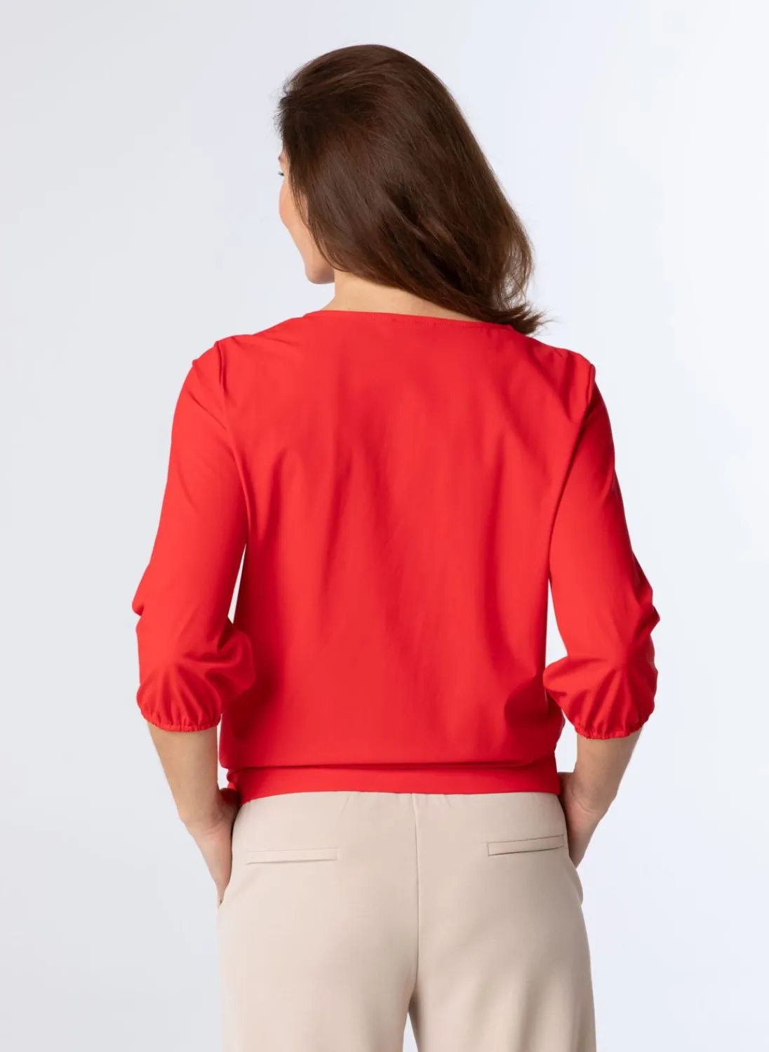 Een Effen Gekleurd Shirt Gemaakt Van Rekbare Travelstof, Met Een Ronde Hals En Korte Mouwen. De Onderkant Van Het Shirt Is Versierd Met Een Elastische Band, Wat Zorgt Voor Een Prachtig Geblouseerd Effect. Dit Veelzijdige En Comfortabele Kledingstuk Is Perfect Voor Elke Gelegenheid, Of Het Nu Een Informeel Uitje Of Een Formeel Evenement Is. Combineer Het Met Je Favoriete Jeans Voor Een Ontspannen Uitstraling Of Kleed Het Aan Met Een Rok Voor Een Meer Verfijnde Outfit. Met Zijn Uitstekende Pasvorm En Stijlvol Ontwerp, Zal Dit Shirt Zeker Een Basisstuk In Je Garderobe Worden.