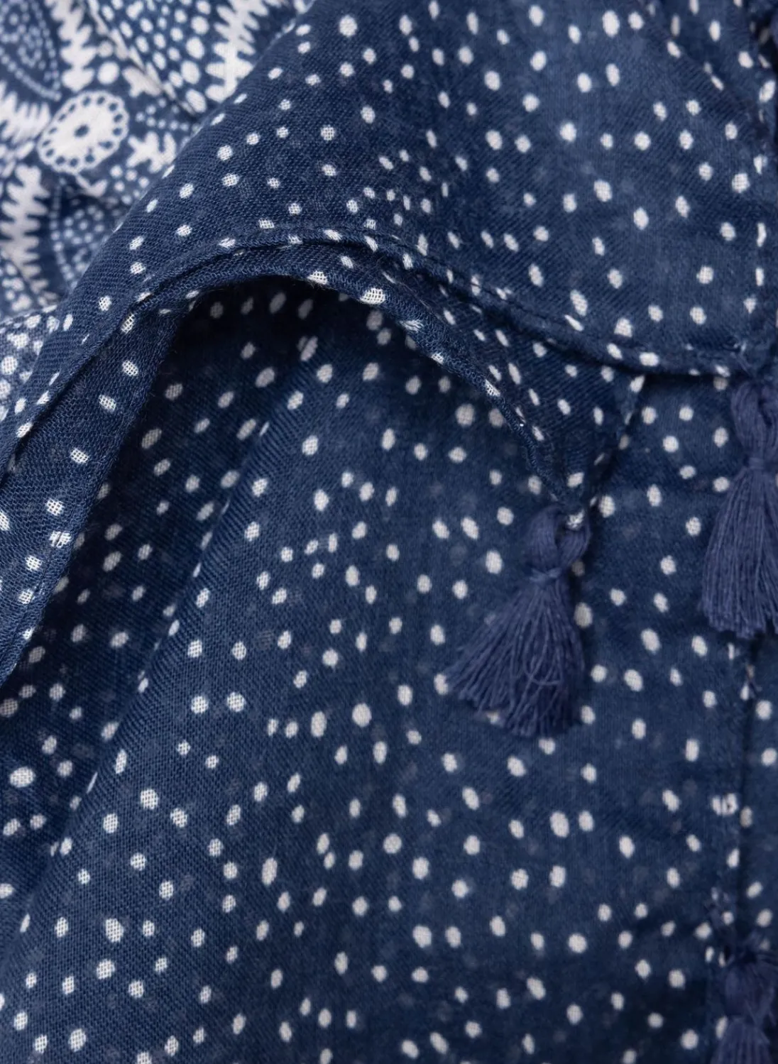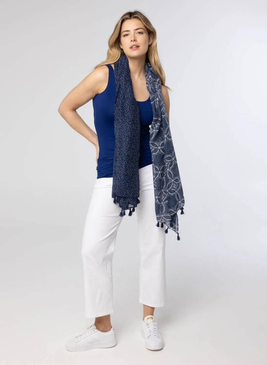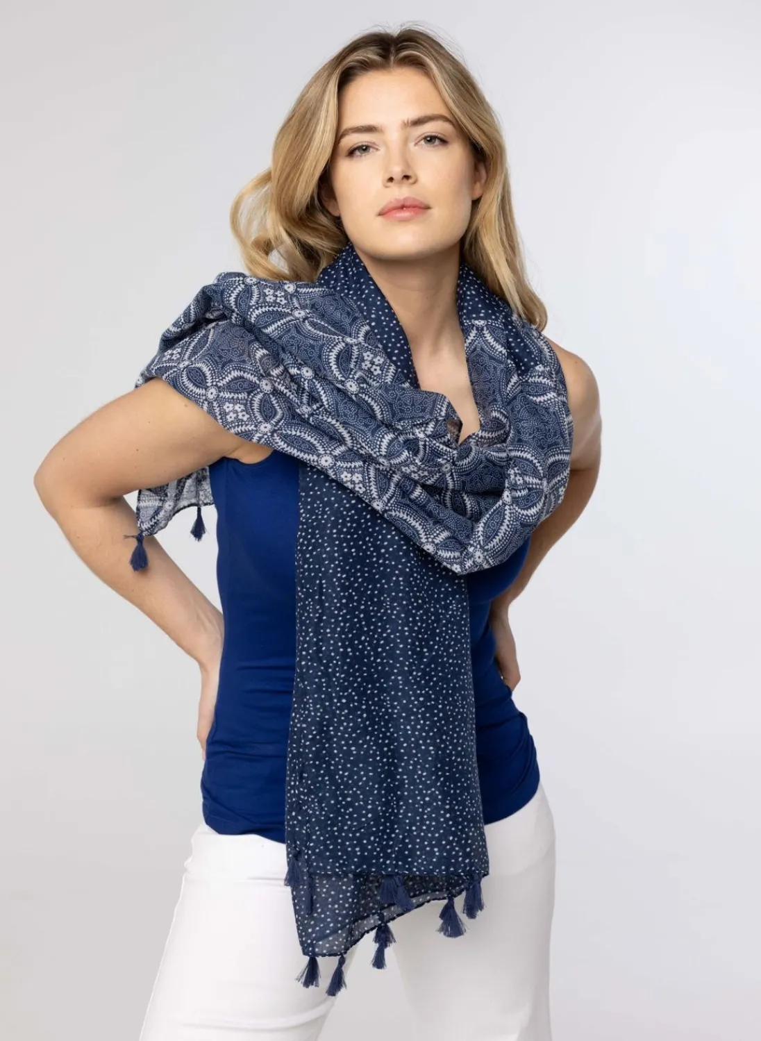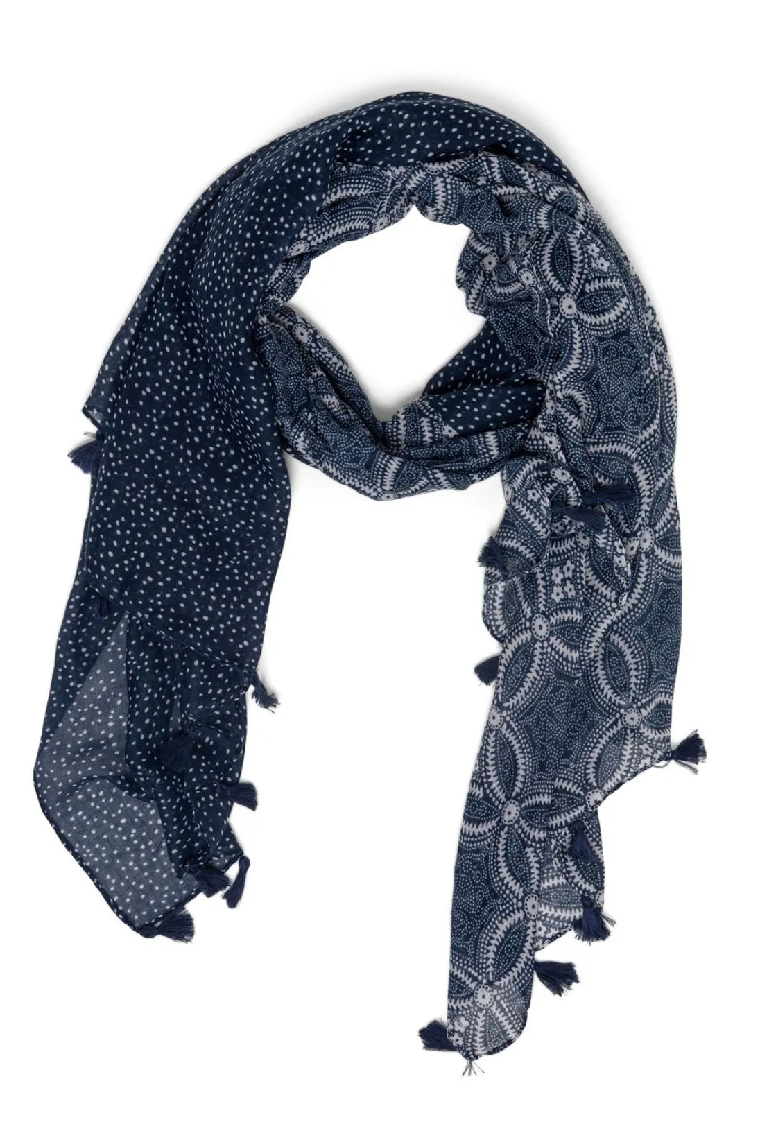 Deze Donkerblauwe En Witte Dungeweven Sjaal Met Grafische Prints Heeft Tassels.