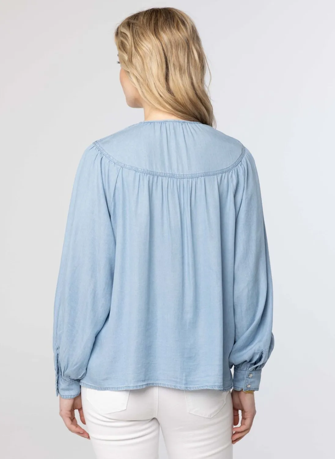 Deze Spijkerblouse Heeft Een Ronde Halslijn Met Koordjes. De Blouse Heeft Een Drukknoopsluiting En Lange Mouwen Met Manchet. Op De Voor- En Achterzijde Is Een Plooinaad Aangebracht.