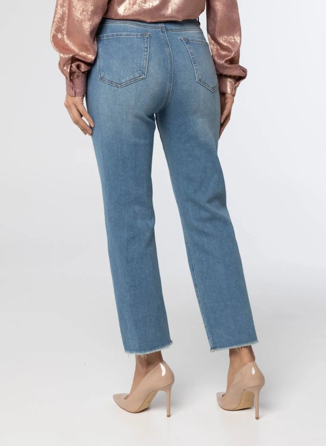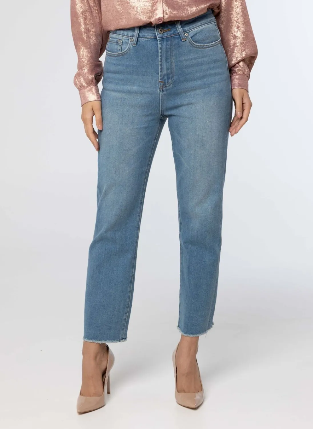 High Waist 5 Pocket Blauwe Spijkerbroek Met Veel Stretch. De Denim Is Enkellang. De Rechte Pijp Eindigt Met Een Rafelrand.