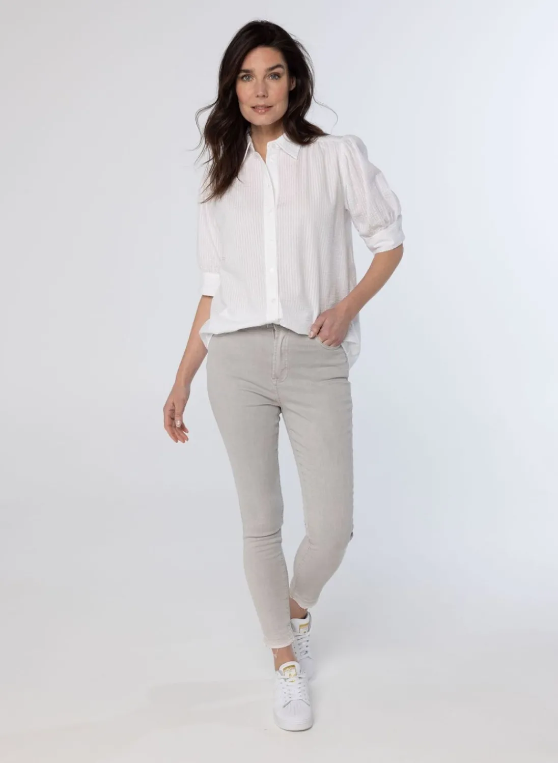 Deze Witte Blouse Van Wafelstof Heeft Een Klassieke Kraag Met Knoopsluiting, Halflange Mouwen Met Een Splitmanchet En Knoop En Geplooide Details Op De Schouder En Rug. De Blouse Is Licht Doorschijnend.